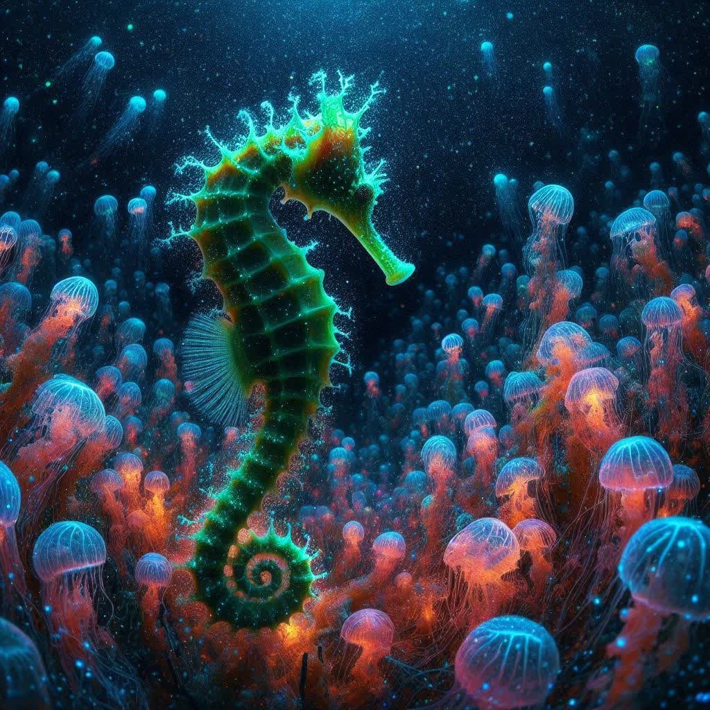 dalle Танец морского конька среди светящихся кораллов и медуз. Картинка из нейросети Далли 3