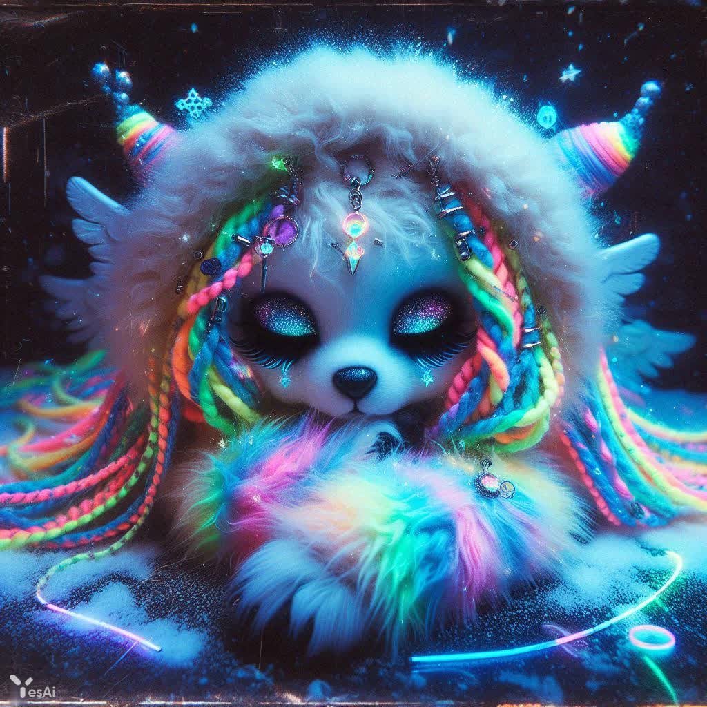 фотореализм, глинч помехи, царапины.опаловое голубое свечение. снежно белый фон.Гот alien антропоморфный пушистое мех существо спит alien гуманойд гибрид космос в капюшоне с неоновыми разноцветными нежно радужными, флуоресцентными узорами и магическим символами,яркие лаймовые неоновые завитухи вихри,светящимися в темноте,с косами разноцветный яркие резиночки украшения, детёныши сидят с крыльями ангела. мистика Fantasy, светящийся грим, лежит на гигантской планете с кольцами