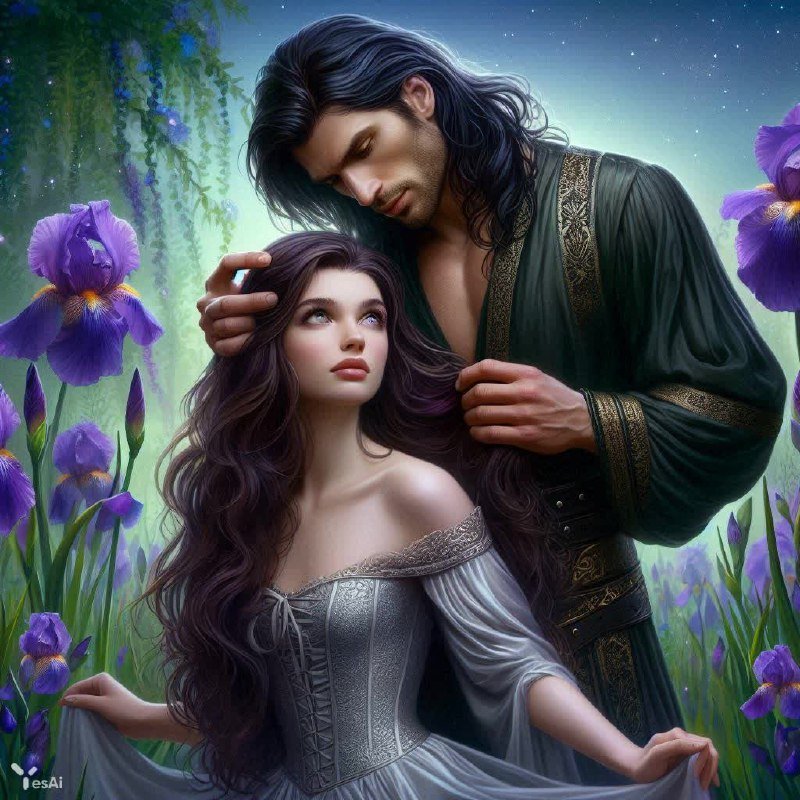Fantasy. A slender girl with long wavy dark-brown hair lies on soft grass, surrounded by vibrant purple irises, in a light silver dress with delicate lace inserts. Above her leans a muscular man with long black hair, in a dark green tunic with gold patterns, gently tucking a lock of her hair behind her ear. Their gazes are full of tenderness and love, looking at each other. Background: an enchanted meadow under a starry sky with a faint magical glow from the irises, soft moonlight, vibrant colors with purple, silver, and green accents, romantic and fairytale-like atmosphere, hyperrealism, 1:2
