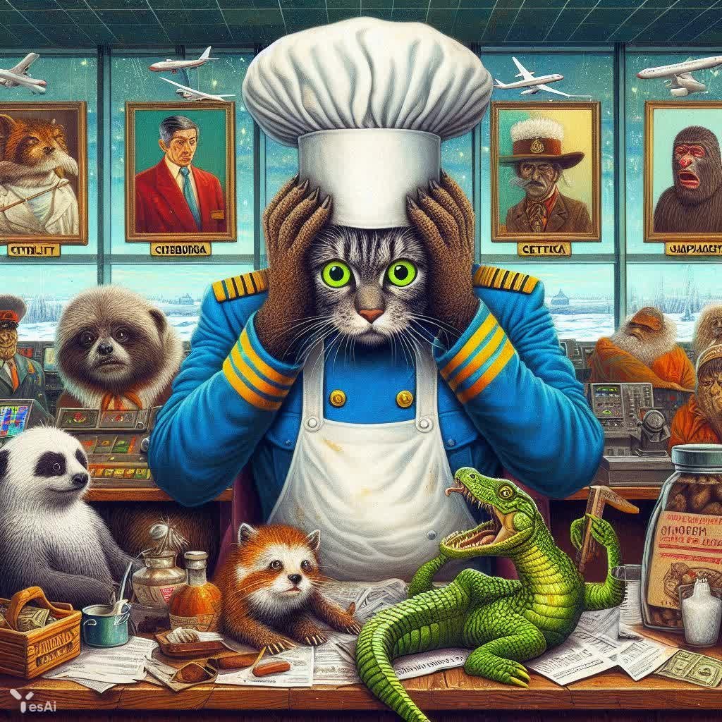 Абсурдная и анекдотическая история - кот-авиадиспетчер в поварском колпаке и ленивец-повар держатся за голову лапами и испытывают информационную перегрузку. Вокруг него мешки с зимними запасами. На стенах портреты Штирлица, Чебурашки и крокодила Гены, Петьки и Чапаева. Сюрреализм, фантастика