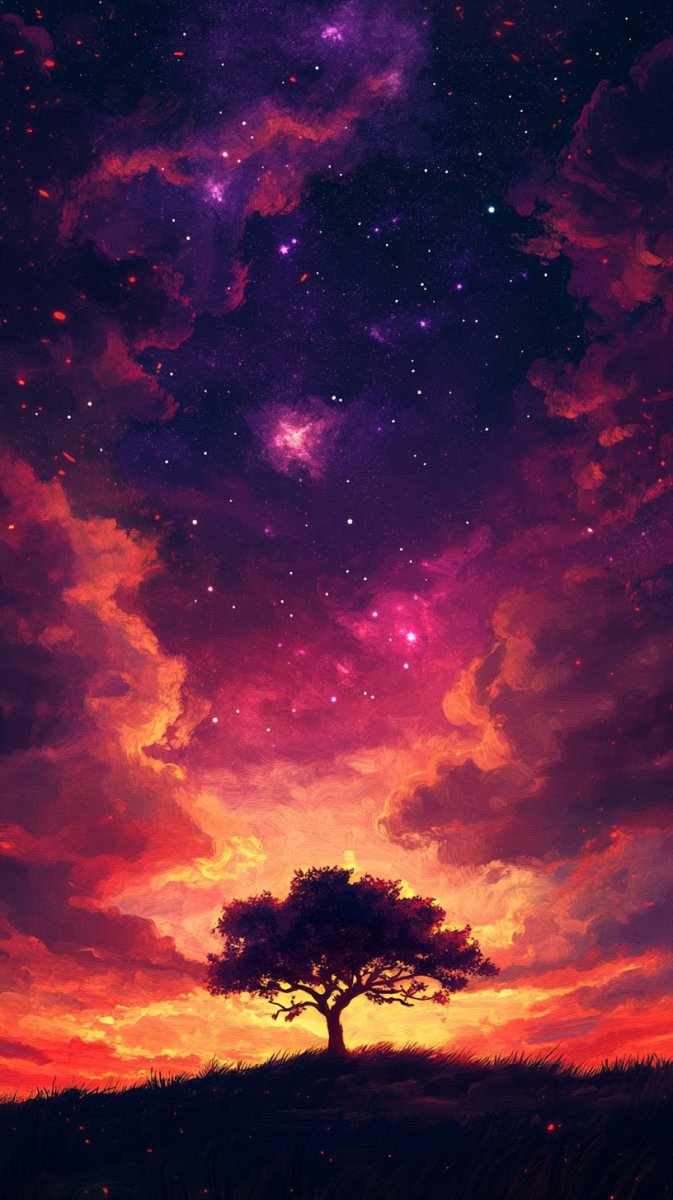 Завораживающая цифровая картина представляет собой величественное зрелище сумеречного неба. Огромные, светящиеся кучевые облака доминируют в небесном пространстве, переливающиеся всеми оттенками глубокого пурпурного, огненно-красного и ярко-оранжевого цветов. Это поистине феерическое сочетание красок создает ощущение нереальности и монументальности. Верхняя часть неба плавно переходит в темное звездное ночное небо, усыпанное видимыми созвездиями и едва заметными падающими звездами, которые словно рассыпаются по бархатному фону. Под этим грандиозным небесным сводом простирается бескрайний, темный открытый пейзаж с низкой линией горизонта, создавая ощущение безграничности и пустоты. На переднем плане возвышается одинокое, корявое, обнаженное дерево, которое является единственным элементом жизни в этой дикой и первозданной местности. Оно стоит как символ стойкости и выносливости, контрастируя с мощью и величием окружающего пейзажа. Эта картина погружает зрителя в атмосферу таинственности и спокойствия, позволяя ощутить себя частью этого удивительного мира. В ней сочетаются элементы фантазии и реализма, создавая неповторимый визуальный опыт, который заставляет задуматься о красоте природы и ее могуществе. Картина передает ощущение тишины и умиротворения, приглашая зрителя в мир грез и мечтаний. Это произведение искусства является настоящим шедевром цифровой живописи, демонстрирующим мастерство художника и его умение создавать потрясающие визуальные образы