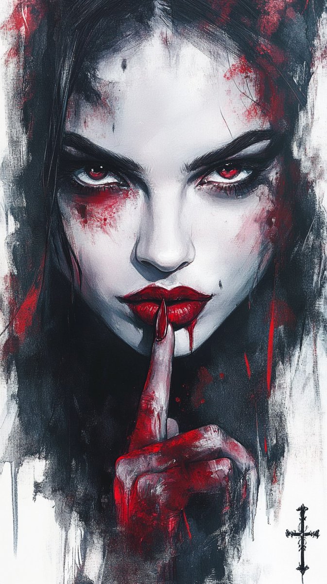 Завораживающий портрет вампирши – воплощение таинственности и роковой красоты. Бледная кожа контрастирует с буйством огненно-красных и глубоких черных волос, ниспадающих объемной волной. Губы подчеркнуты дерзким макияжем с размытым красным оттенком, а прикосновение пальца к губам словно приглашает к молчанию, хранящему древние секреты. Изящный крест-серьга и темный чокер добавляют образу загадочности и намекают на борьбу между светом и тьмой. Высокий контраст создает ощущение драматизма, а живописная техника с акварельными разводами придает изображению неповторимую текстуру и глубину. Белый фон подчеркивает выразительность портрета и фокусирует внимание на модели. Игра света и тени усиливает эффект таинственности, делая образ вампирши по-настоящему завораживающим. Художественный стиль Антона Оксенюка проявляется в мастерском владении цветом и светом, создавая произведение искусства, которое захватывает дух своей красотой и загадкой. Это не просто портрет – это история, запечатленная на холсте, повествующая о вечной тьме и неугасающей страсти. Взгляд вампирши пронзителен и полон скрытых смыслов, приковывая внимание зрителя и оставляя неизгладимое впечатление. Картина излучает ауру опасности и соблазна, заставляя задуматься о темной стороне человеческой природы
