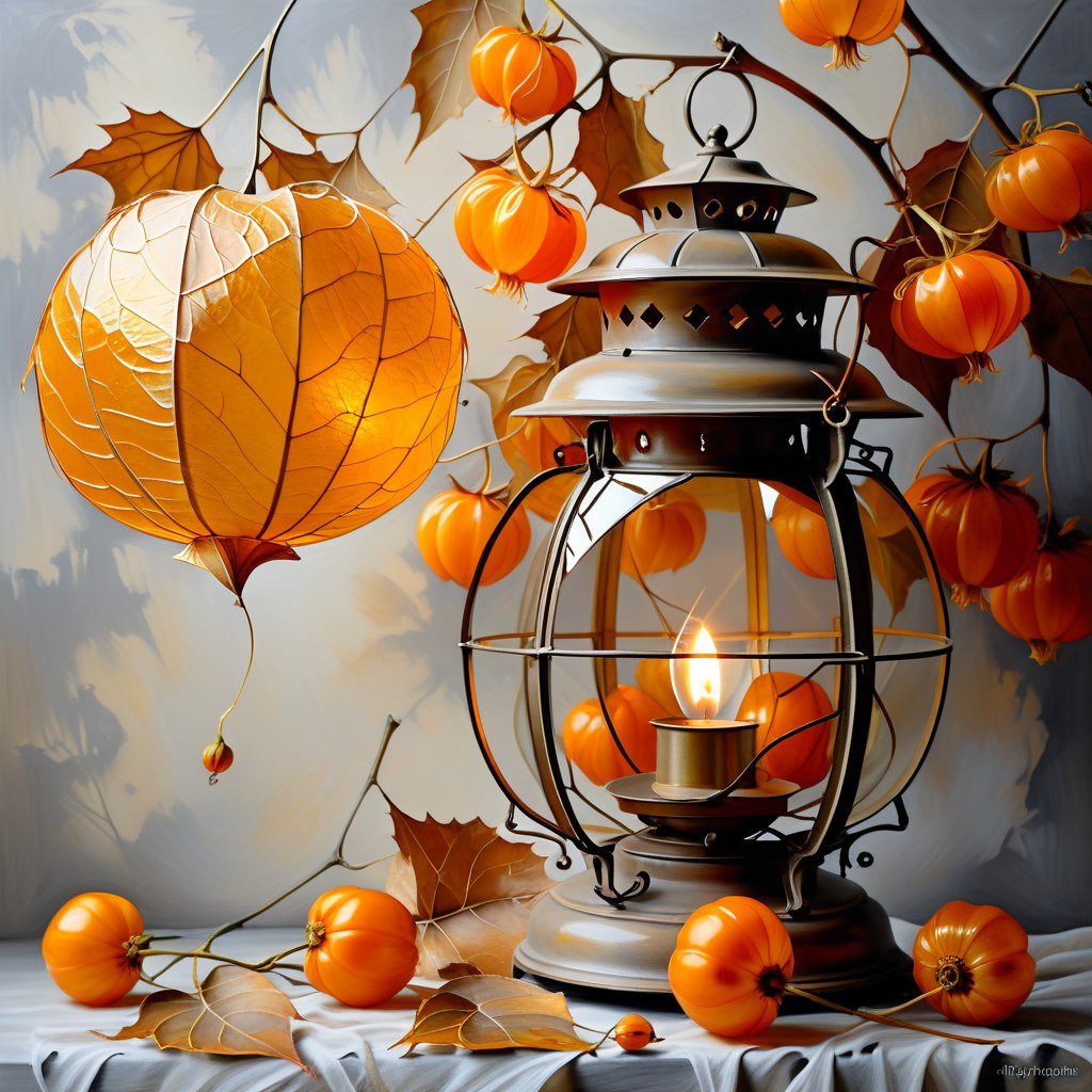 Осенний натюрморт с фонарем из фонарейника в мягком свете - Картинка, полученная с помощью нейросети Stable Diffusion