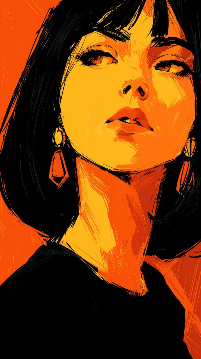 #1. bauhaus, dadaism, ink drawing, illustration portrait of a woman with short black hair in bob, serious expression, eyes looking directly at viewer, wearing large colorful geometric earrings, lips deep red, BG filled with shades of orange and yellow, style is abstract with bold brushstrokes, mood is contemplative and mysterious. #role_bauhaus