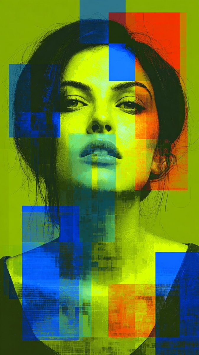 Изображение представляет собой яркий и динамичный портрет женщины, выполненный в духе баухауса и дадаизма. Лицо модели, с темными волосами, собранными наполовину вверх, выражает серьезность и сосредоточенность, при этом губы слегка приоткрыты, создавая ощущение задумчивости. Главная особенность портрета – его деконструкция на множество разноцветных квадратов и прямоугольников, характерную черту стиля баухаус. Эти геометрические фигуры образуют сложную мозаику, которая одновременно подчеркивает структуру лица и создает абстрактный визуальный эффект. Фон изображения также выполнен в виде яркой цветовой палитры, смешивая насыщенные оттенки красного, синего, зеленого и желтого цветов, что усиливает общее впечатление яркости и динамизма. Техника исполнения напоминает черничную графику с элементами иллюстрации, придавая работе особый художественный шарм. Портрет передает дух эксперимента и свободы, свойственные дадаистскому направлению в искусстве, при этом сохраняя четкую геометрическую структуру, присущую баухаусу. В целом, это произведение представляет собой уникальное сочетание разных стилей и техник, создавая яркий и запоминающийся образ женщины, воплощенный в форме абстрактной мозаики. Использование контрастных цветов и геометрических форм создает визуальную гармонию, а серьезное выражение лица модели добавляет портрету глубины и загадочности