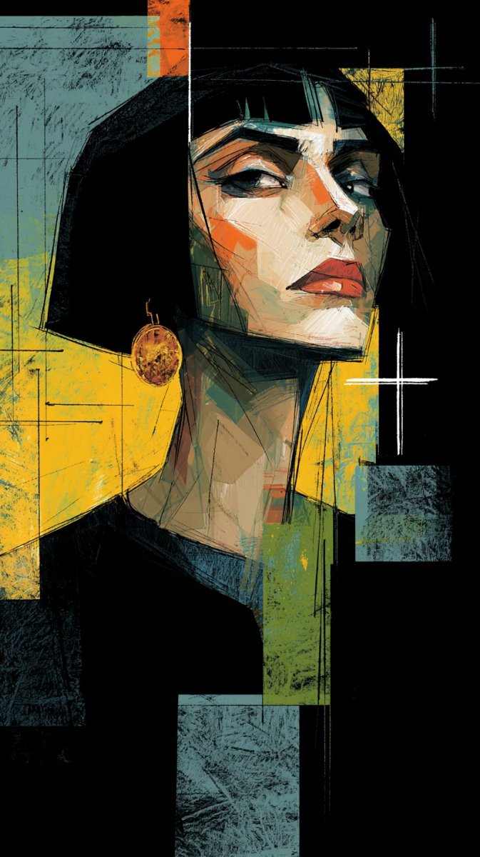 Загадочный портрет в духе баухауса и дадаизма. Инкрустация чернильных линий создает абстрактный образ мужчины с пронзительным взглядом, устремленным вдаль. Рядом – задумчивая женщина лет двадцати пяти-тридцати, ее темные волосы собраны в элегантный боб, а на лице застыло серьезное выражение. Фон представляет собой калейдоскоп ярких оттенков: оранжевый, желтый, зеленый, с акцентом красного креста в левом верхнем углу – отсылка к революционным идеям эпохи. Смелые, широкие мазки кистью придают работе динамичность и экспрессию. Женщина украшена крупными серьгами с яркими деталями: сочетание красных и золотых акцентов, геометрические фигуры – треугольники, квадраты и прямоугольники в различных оттенках синего – подчеркивают архитектурную строгость стиля баухаус. Общее настроение полотна пронизано мрачностью и меланхолией, создавая атмосферу таинственности и интроспекции. Композиция сочетает в себе элементы портретной живописи с абстрактным подходом к форме и цвету, что делает ее уникальным произведением искусства, отражающим дух авангарда начала XX века. Картина словно запечатлевает мгновение размышления о судьбе человека в эпоху перемен, наполненное внутренним конфликтом и скрытой силой. Это не просто портрет, это визуальная поэма, написанная языком форм и цветов