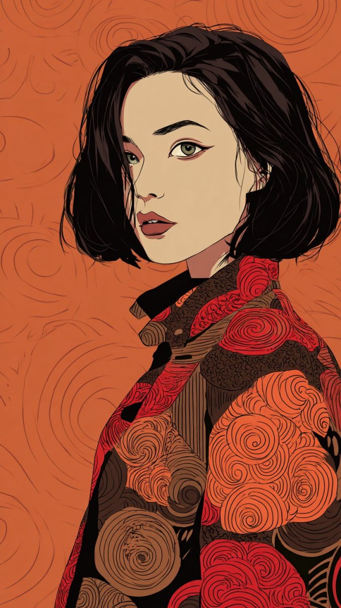 bauhaus, dadaism, ink drawing, illustration portrait of woman’s face, realistic style, short black hair styled in bob, eyes looking directly at viewer, lips painted deep red, nose in lighter shade of red, wearing colorful jacket with geometric pattern, BG warm orange-brown, swirls and patterns, painting done in loose abstract style #role_bauhaus