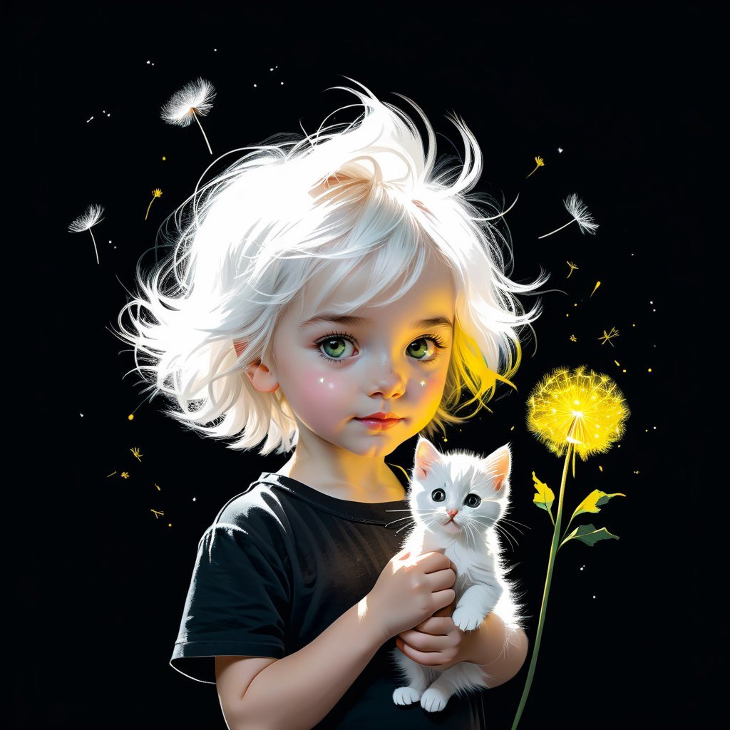 stable diffusion Девочка с котенком в темноте и одуванчиками. Картинка из нейронной сети Stable Diffusion