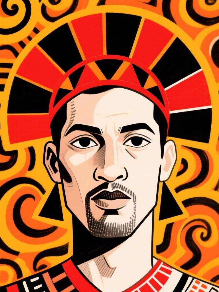 Встречайте захватывающее переплетение эпох и стилей – портрет, сотканный из наследия Баухауса, дерзости дадаизма и глубины африканской художественной традиции. Это не просто изображение, это визуальная поэзия, где геометрическая строгость встречается с буйством красок и экспрессивной силой. Лицо мужчины, выполненное в технике чернильного рисунка и иллюстрации, оживает благодаря смелому сочетанию оранжевого, желтого и черного цветов. Изысканные детали, сложный орнамент и пронзительный взгляд, направленный прямо на зрителя, создают ощущение живого присутствия. Полуоткрытый рот добавляет портрету нотку загадочности и внутренней динамики. Фон, представляющий собой вихрь абстрактных узоров из кругов, квадратов и треугольников, усиливает общее впечатление от произведения, подчеркивая его многогранность и современный характер. Яркий красный и черный головной убор с геометрическим дизайном завершает этот уникальный образ, объединяя в себе элементы разных культур и художественных течений. Каждая линия, каждый цвет, каждая форма несет в себе глубокий смысл, приглашая зрителя к созерцанию и размышлению о природе творчества и человеческой идентичности. Этот портрет – манифест свободы выражения и смелого эксперимента, воплощенный в двухмерном пространстве. Это визуальный гимн Баухаусу, дадаизму и африканскому искусству, гармонично сочетающим в себе традиции прошлого и новаторство современности. Произведение поражает своей энергией и глубиной, оставляя неизгладимое впечатление