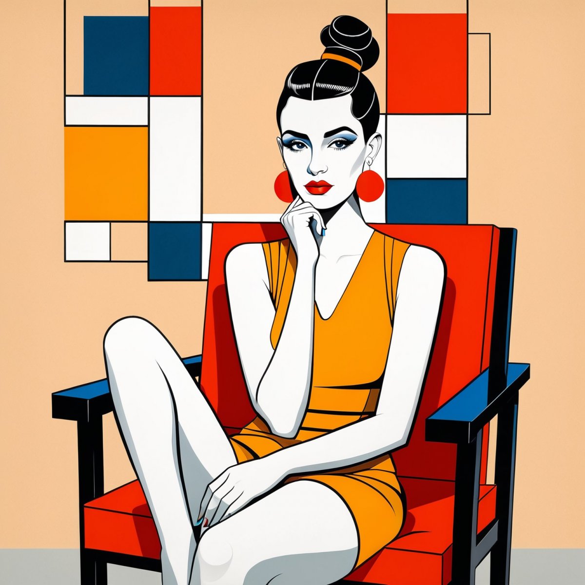 Элегантная дадаистская интерпретация в духе Баухауса – завораживающая иллюстрация женщины, воплощающей геометрическую гармонию и эмоциональную глубину. В центре композиции – фигура незнакомки, сидящей на насыщенно-красном стуле, утопающем в теплых оранжево-коричневых тонах. Её поза расслаблена: руки покоятся на коленях, а взгляд, обрамленный короткими черными волосами, собранными в высокий пучок с игривыми локонами, пронизывает зрителя серьезностью и загадочностью. Глаза выделяются ярким сочетанием синего и красного – намек на внутренний конфликт или бурлящие эмоции. Фон представляет собой сложную мозаику из геометрических форм: прямоугольников, квадратов и динамичных желтых узоров, создающих ощущение движения и визуального ритма. Завершают образ крупные серьги-подвески с акцентами красного цвета, подчеркивающие ее индивидуальность и добавляющие нотку эксцентричности. Эта работа – не просто иллюстрация, а исследование взаимодействия между формой и содержанием, эмоцией и рациональностью, наследием Баухауса и бунтарским духом дадаизма. Каждая деталь тщательно продумана, чтобы создать мощный визуальный образ, который заставляет задуматься о роли женщины в современном мире и о силе искусства как средства выражения сложных чувств и идей. Рисунок выполнен с использованием техники туши, что добавляет ему графичности и лаконичности, усиливая его воздействие на зрителя и подчеркивая уникальность стиля