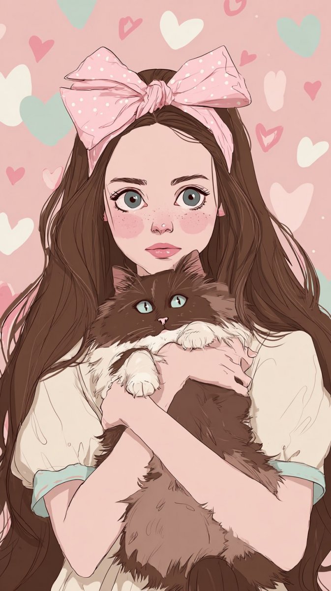 a cute girl with long brown hair and big eyes, wearing a soft sweater, holding a gray cat in one hand, pastel purple background, full-body portrait, simple lines, flat painting, whimsical, white lace border around the edges, fluffy fur, bright colors, detailed depiction of its fur texture, children's book illustration style, high resolution, hearts all over the background, cute paws, puffy belly, a pink bow headband with a white heart pattern decoration against a pink background, in the style of Lilia Alvarado and Beatrie Potter #role_cute_girl