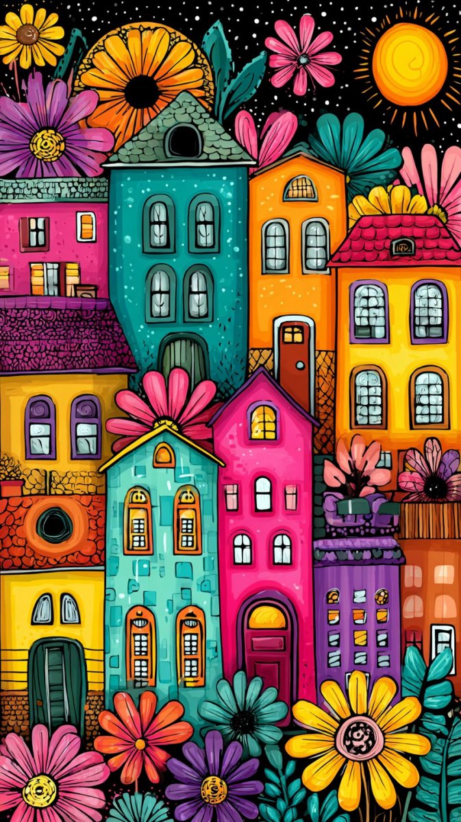 Очаровательный мир сказочных домов, словно сошедших с полотен художников Томаса Кинкейда и Анны Гармаш. Нежные пастельные тона, четкие черные контуры и причудливые узоры на окнах создают атмосферу волшебства и безмятежности. Каждая деталь продумана до мелочей: от замысловатых орнаментов до ярких ромашек, расцветающих по всему поселению. Радостное солнце выглядывает из-за домов, освещая красочную фантазийную улочку, утопающую в цветах. Эта картина – настоящий праздник для глаз, сочетающий в себе наивное искусство и технику Zentangle с яркими красками мультяшного стиля. Это детальная живопись, полная тепла и позитива, приглашающая зрителя окунуться в атмосферу уютной деревни, где царит гармония и счастье. Идеальный выбор для тех, кто ценит красоту, детализацию и оригинальность, желая привнести частичку сказки в свое окружение. Яркие цвета и наивная стилистика создают ощущение легкости и радости, а продуманный дизайн домов подчеркивает их индивидуальность и неповторимость. Это не просто изображение – это целая вселенная, наполненная мечтами и хорошим настроением