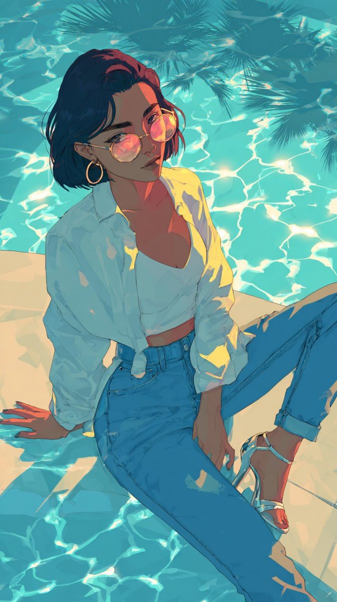 model girl with red hair wearing blue jeans smooth skin glossy finish vibrant outfit standing on urban street soft natural lighting, crystal-clear waves gentle ripples reflecting sunlight surrounded by sandy beach two palm trees swaying in the breeze elegant curves of the vase shimmering fabric high slit on one side silver high heels subtle shine sitting on wooden table, makeup in shades of blue detailed eye makeup with sparkly earrings accessories include sleek silhouette bright and inviting ambiance #role_blue