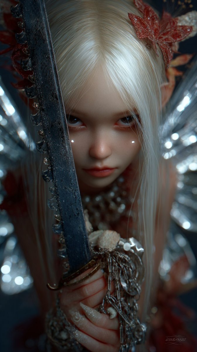 Завораживающая иллюстрация, где темная фея с лукавым блеском в глазах и длинными ресницами держит в крошечных пальчиках сверкающую бензопилу. Вокруг нее простирается сюрреалистичный лес, расписанный в ярких кинематографических тонах. Картина поражает детализацией в формате 4K, сочетая свирепость и нежность в едином дыхании. Создается впечатление, будто ее вылепили из снов по мотивам работ WLOP для конкурса CGSociety. Ее кукольная фигура излучает одновременно опасность и неотразимое очарование. Эта работа представляет собой уникальное сочетание темной магии, дерзости и хрупкости, выполненное с невероятным мастерством и вниманием к каждой детали. Иллюстрация завораживает своей красотой и загадочностью, заставляя зрителя задуматься о природе добра и зла, силы и слабости. Она словно ожившая сказка, где привычные образы приобретают новые грани и смыслы. Художник сумел создать поистине волшебный мир, полный тайн и приключений. Это произведение искусства станет прекрасным украшением для любого пространства и подарит своим обладателям ощущение чуда и вдохновения. Яркие цвета, тонкая работа с деталями и необычный сюжет делают эту иллюстрацию незабываемой и запоминающейся
