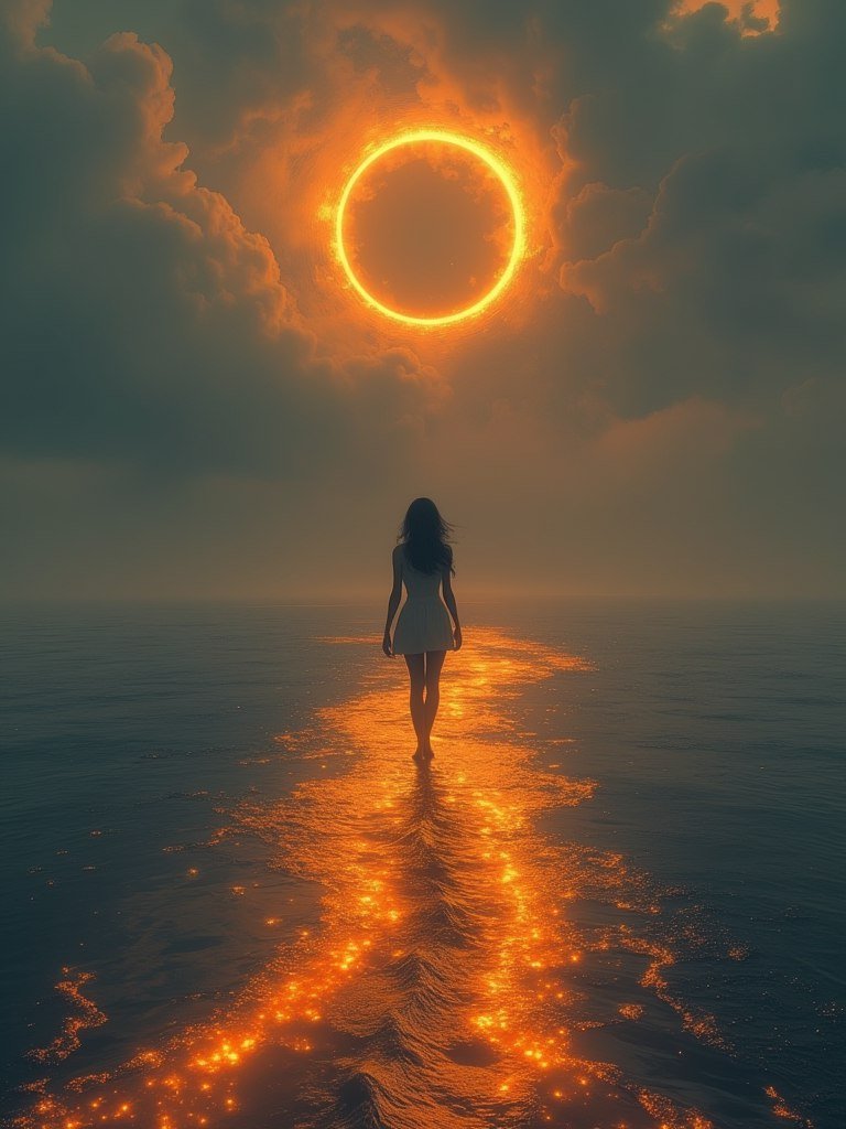 A solitary figure, a dark silhouette, walks toward a bright, glowing orange ring in a surreal, dreamlike scene. The figure is a young woman standing with her back to the viewer, dressed in a short, flowing dress that hints at graceful movements. A bright, glowing orange path, reflecting the heavenly ring in the sky, stretches from the foreground and leads the woman forward. The path is reflected in the ripples on the water, and the figure crosses the sea or ocean. The background is a gradient of deep blue and gray tones, transitioning from darker tones at the bottom to lighter shades at the top, creating a soft, ethereal atmosphere. A bright ...