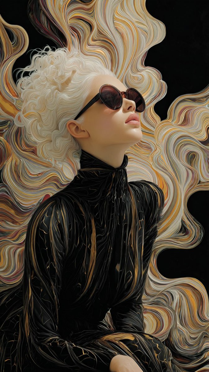 Изысканный цифровой портрет, сотканный в духе великих мастеров – Тамары де Лемпицкой, Алекса Гаран и Джейсона Брукса. В центре композиции – пленительная красавица с вороными волосами, неторопливо отдыхающая в обстановке роскоши. Её шелковистые локоны волнами струятся вокруг, создавая завораживающий эффект движения и плавности линий. Нежные переливы жемчужного света и глубокие тени мягко играют на сияющей коже, подчеркивая безупречность её овала лица и грации фигуры. Фон картины растворяется в призрачной дымке из черных и серебряных оттенков, придавая изображению особую магнетическую силу и атмосферу загадочности. Каждое касание кисти, каждый штрих – это дань уважения авангардной моде и искусству высокой моды, воплощенные в современной цифровой интерпретации. Эта работа – торжество чувственности, современного абстракционизма и элегантности, демонстрирующее неповторимое сочетание классической красоты и новаторского подхода к визуальному искусству, завораживая своей изысканностью и оставляя неизгладимое впечатление в памяти зрителя. Это не просто изображение – это погружение в мир роскоши, стиля и вечной привлекательности