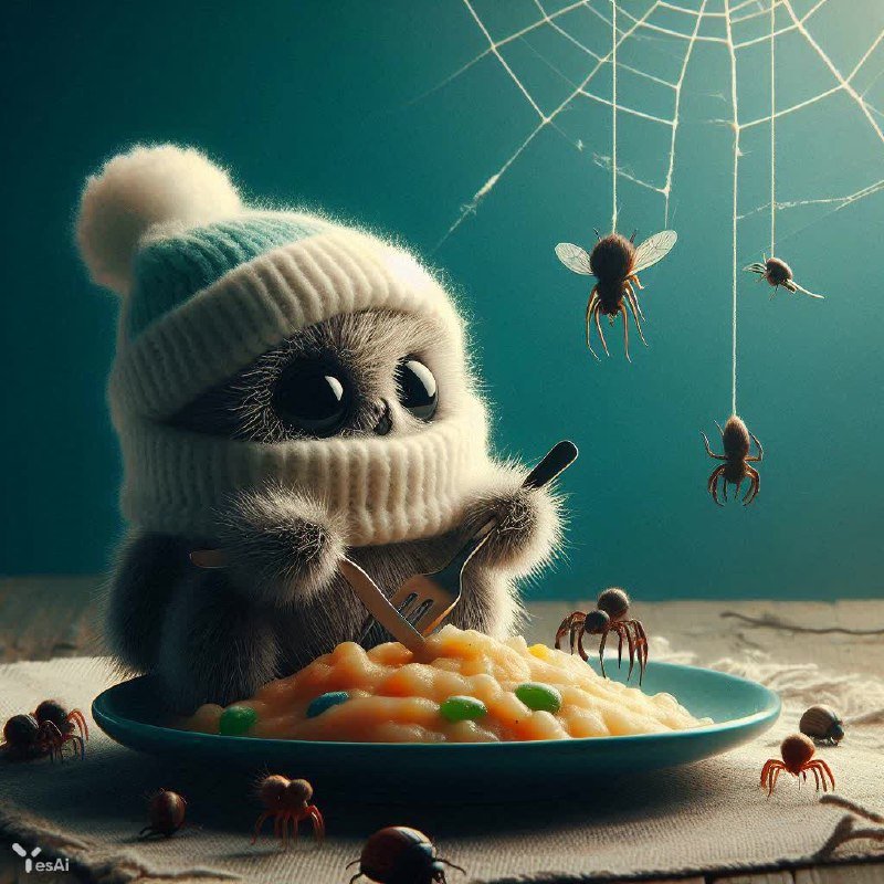 Паучок-гурман с необычным обедом и белоснежным шарфом на шее - Генерация изображения с помощью нейросети Dalle