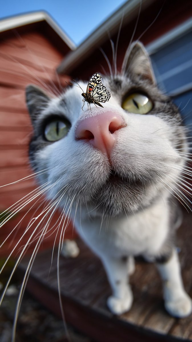 Невероятное сочетание нежности и удивления запечатлено на этом снимке – огромная бабочка примостилась прямо на носу кота, вызывая искреннее изумление в его глазах. Фотография, вдохновленная творчеством Эльке Фогельзанг, выполнена с использованием эффекта рыбийего глаза, создавая забавную перспективу и добавляя динамики композиции. Детализация поражает воображение: каждая шерстинка на мордочке кота, каждый узор крыльев бабочки проработаны с фотореалистичной точностью. Это настоящий портрет в стиле мультфильма, где пушистое личико животного выражает неподдельную эмоцию. Яркий солнечный день подчеркивает насыщенность цветов и создает ощущение тепла и уюта. Кажется, что кот замер в ожидании чуда, любуясь красотой этого хрупкого создания. Снимок излучает позитив и юмор, идеально подходя для любителей милых животных и необычных фотоколлажей. Это произведение искусства способно вызвать улыбку у каждого зрителя, демонстрируя гармонию между природой и забавными ситуациями, которые она преподносит. Потрясающая детализация и реалистичность делают этот кадр настоящим украшением любой коллекции фотографий