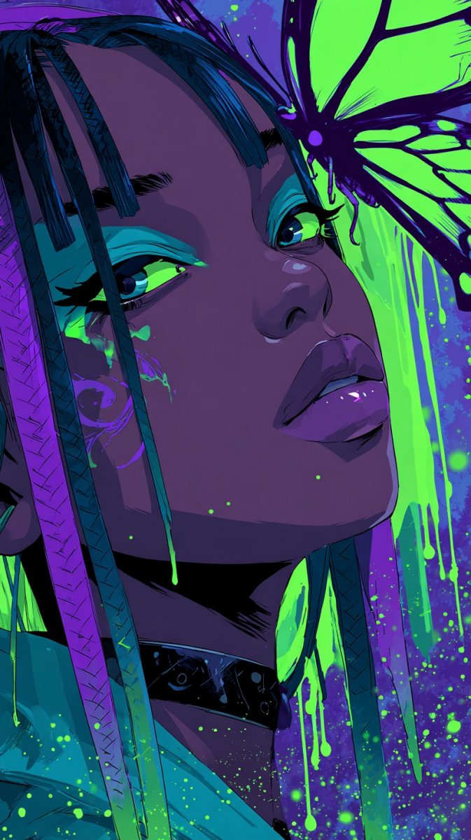 a girl with vibrant purple and green hair showcases intricate tattoos and bold makeup featuring neon accents. her large, expressive eyes shine with bright green irises, highlighting the striking contrast against her dark skin. butterfly wings elegantly adorn her face, while a fluid, glowing green substance drips down, adding an ethereal vibe. the background is a colorful blur, filled with splashes and sparkles, enhancing the vivid theme. #role_dripping