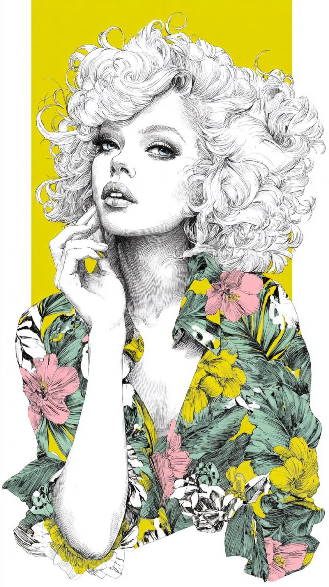 Яркая иллюстрация в технике туши, демонстрирующая экстравагантную блондинку с пышными кудрявыми волосами, напоминающими барби. Модель предстает в смелом тропическом хиппи-наряде, дополненном броскими аксессуарами и поразительным неоновым макияжем. Вокруг нее – буйство красочных неоновых цветов, создающих атмосферу высокой моды и художественного самовыражения. Картина пронизана энергией вибрирующих узоров и нарочитой китчевости, формируя уникальный визуальный язык. Это смелое сочетание элементов создает запоминающийся образ, играющий с контрастами и подчеркивающий индивидуальность модели. Яркие цвета и необычные детали делают эту работу настоящим произведением искусства в стиле неоновой моды, где каждый элемент призван удивлять и вдохновлять. Здесь переплетаются элементы высокой моды, уличной культуры и яркой богемности, создавая неповторимый стиль. Эта работа – ода смелости, креативности и безудержной фантазии, воплощенная в деталях и цветах. Она привносит свежий взгляд на мир моды, предлагая зрителю окунуться в атмосферу ярких красок и дерзкого самовыражения