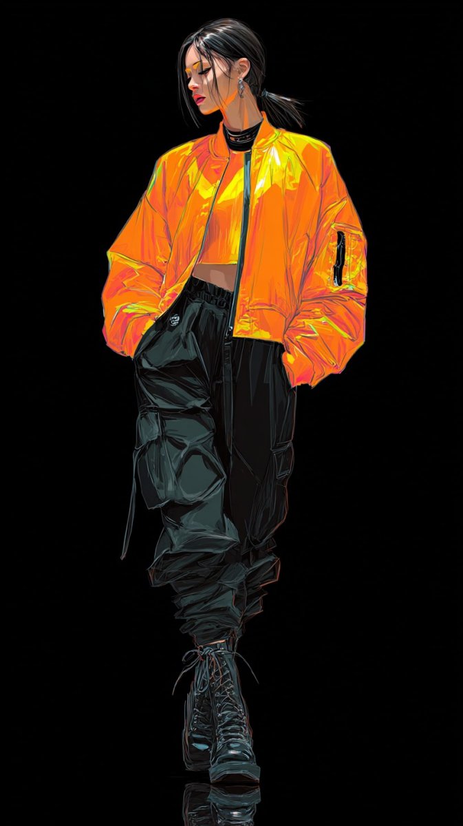 illustration, ink drawing, fashion model, neon colors wearing a fluorescent orange cropped bomber jacket with shiny finish, high-waisted black cargo pants with multiple pockets, black combat boots, long dark hair styled in a sleek ponytail, striking a pose against a contrasting yellow background, exuding a bold and modern edge. #role_fashion_model