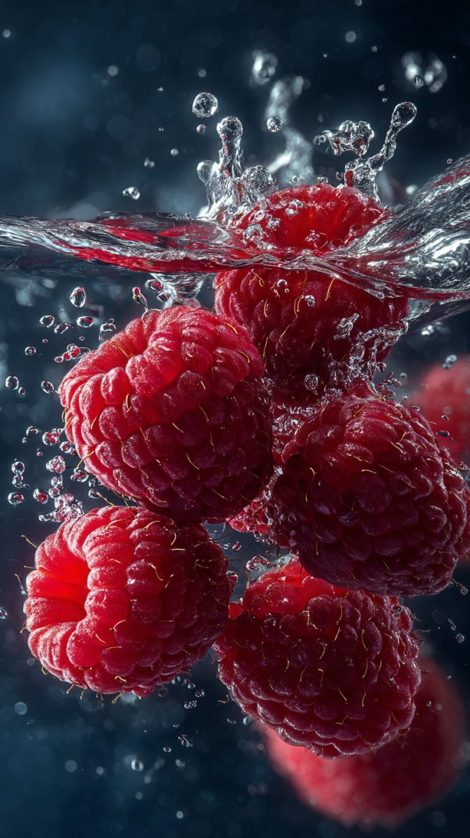 a close-up of vibrant red raspberries splashing into crystal clear water, creating dynamic ripples and droplets against a rich dark BG, high contrast, macro lens, soft lighting, photorealistic, delicious textures, sharp focus, high quality, capturing the essence of freshness and vitality#role_food