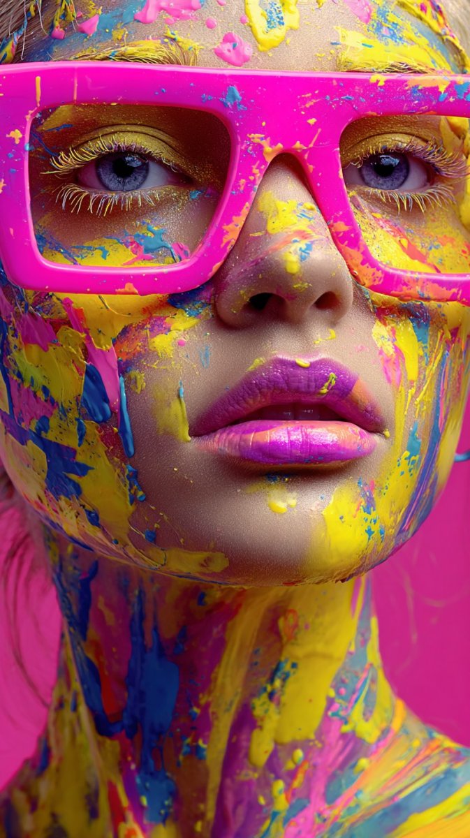 midjourney Яркая красота: неоновые очки и капли краски на лице. Картинка из нейросети Миджорни