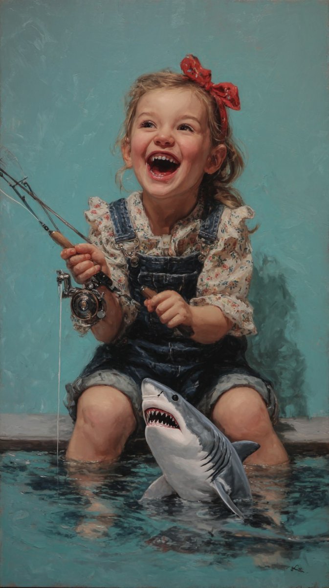 Запечатлённый момент беззаботного детства: маленькая девочка заливисто смеётся в уютной гостиной, крепко сжимая удочку и прозрачный пакет. Внутри этого необычного 'аквариума' плавает крошечная акула, создавая волшебную картину игривости и удивления. Эта захватывающая сцена вдохновлена гиперреалистичными стилями известных художников Криса Лабры и Сергея Красовского, что придаёт ей невероятную живость и эмоциональность. Каждая деталь проработана с кинематографической точностью, словно кадр из высокобюджетного фильма, передающий искреннюю радость и триумф юной рыболовки. Взгляд невольно приковывается к деталям: выражение лица девочки, прозрачность воды в пакете, реалистичная фактура удочки – всё это создает ощущение полного погружения в этот счастливый момент. Это больше чем просто фотография – это история, рассказанная языком искусства, наполненная детской непосредственностью и безграничной фантазией. Картина излучает теплоту и позитив, вызывая чувство ностальгии по беззаботному времени игр и открытий. В этом ярком снимке оживает мечта о захватывающих приключениях и маленьких победах, которые делают детство таким особенным и незабываемым. Этот кадр – воплощение радости, увлечённости и чистоты души ребёнка