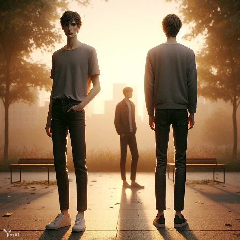 В полумраке уходящего дня, в осеннем парке, застыла сцена немого диалога. Хрупкая фигура женщины, облаченной в нежно-молочный сарафан с кружевными вставками, словно сотканная из света и тени, излучает тонкую печаль. Ее длинные светлые волосы мягко обрамляют лицо с бледной кожей и серыми, задумчивыми глазами, отражающими уходящее солнце. Рядом, отстраненный и загадочный, стоит мужчина – его кожа цвета легкого какао контрастирует с бунтарским духом черной кожаной куртки и футболки с ярко-неоновым красным принтом. Темные, вьющиеся волосы обрамляют лицо, полное скрытой силы и невысказанных эмоций. Они стоят спиной к спине, словно два мира, разделенные невидимой стеной, но оба поворачивают головы к зрителю с нейтральным выражением, хранящими свои тайны. За их плечами – увядающий городской парк, залитый мягким светом заката. Опавшие листья шуршат под ногами, а вдалеке едва различима скамейка, словно приглашающая к размышлениям о быстротечности времени и неизбежности перемен. Цвета реалистичны, с акцентами молочного, черного и неонового красного, создающими атмосферу напряженности и меланхолии, пронизывающую каждую деталь этой гиперреалистичной сцены. Вся композиция передает ощущение застывшего момента, наполненного невысказанными чувствами и скрытым драматизмом, приглашая зрителя стать свидетелем их молчаливого противостояния. Кажется, что в любой момент может произойти что-то важное, но время словно остановилось, позволяя насладиться красотой и глубиной этого момента