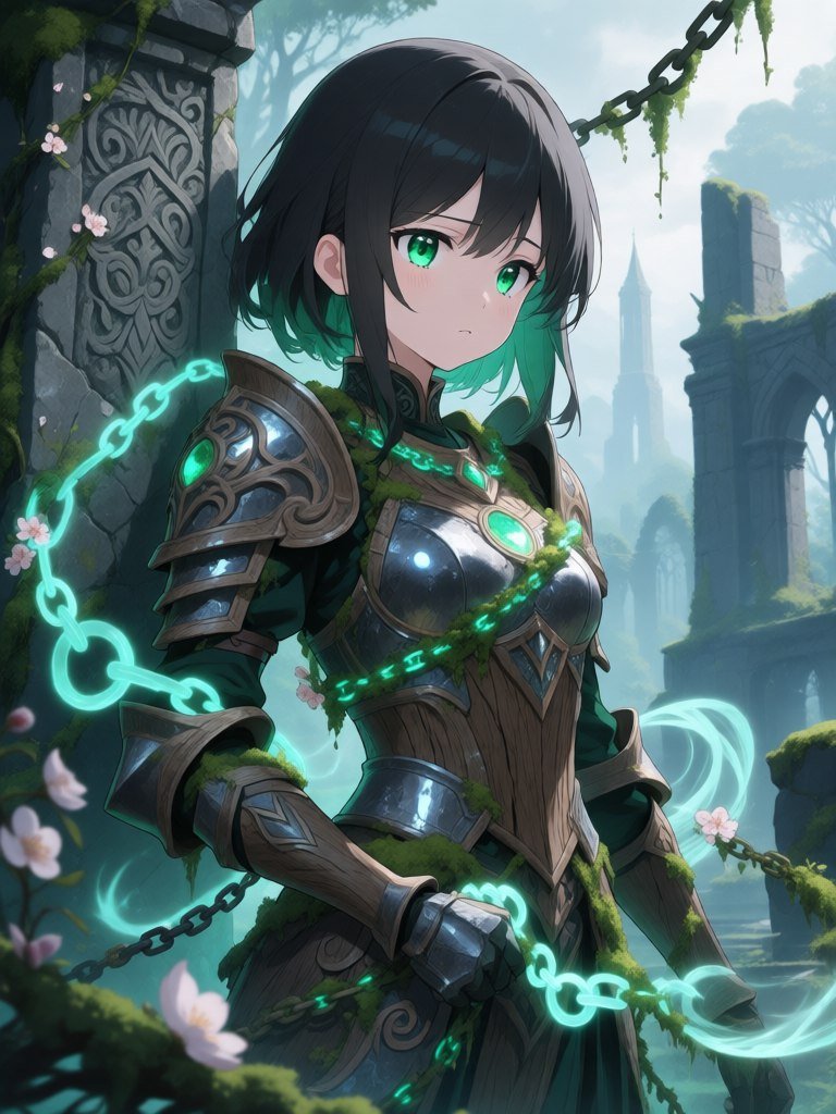 <lora:1914845:1>, anime, illustration 1girl, (revenant|sage), ancient weathered stone carvings swirling around her form, glowing emerald eyes reflecting forgotten lore, spectral chains interwoven with blossoming vines and luminous moss, a wistful expression as she recalls fragmented memories of lives long past 😔, detailed ornate armor crafted from petrified wood and shimmering moonlight, standing amidst a ruined elven city overtaken by an ethereal forest, dramatic lighting highlighting the contrast between decay and vibrant regrowth.
