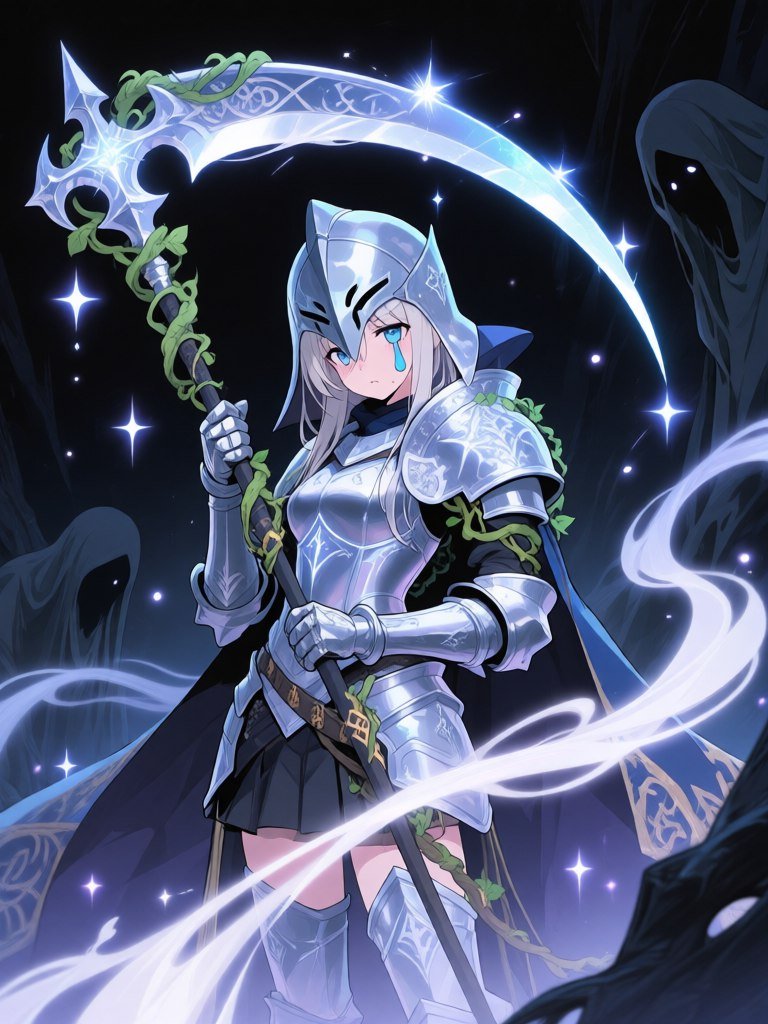 <lora:1914845:1>, anime, illustration 1girl, (revenant knight|spirit guide), clad in spectral armor interwoven with glowing vines and ancient runes, wielding a shimmering scythe that leaves trails of stardust, her face partially obscured by a haunted helm yet hinting at an expression of melancholic determination as ethereal wisps swirl around her, guiding lost souls through shadowed realms, 😭.