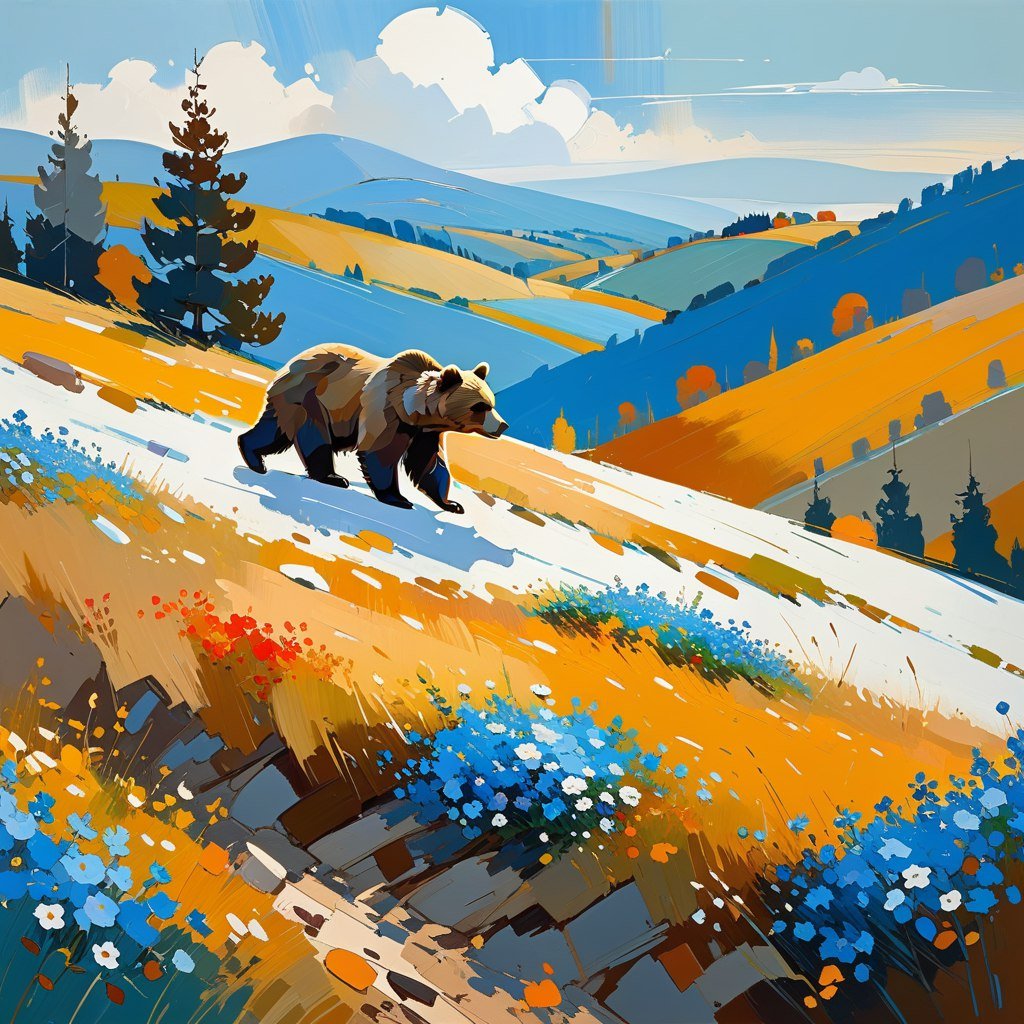 Нежная осенняя сцена, выполненная в манере Абрама Маневича, завораживает своей простотой и утонченностью. В центре композиции – игривый медвежонок, спускающийся по склону холма, окутанного золотом осени. Абстрактный пейзаж, лишенный излишней детализации, передает ощущение спокойствия и гармонии с природой. Маленькие синие цветы, словно акценты на нейтральном фоне, добавляют картине свежести и живости. Минимализм в духе художника проявляется в лаконичных геометрических формах и сдержанной цветовой палитре: преобладают нежные оттенки белого, таупа, голубого и темного бежевого. Линейная композиция подчеркивает динамику движения, создавая ощущение легкости и воздушности. Картина излучает спокойствие и умиротворение, приглашая зрителя окунуться в атмосферу осеннего леса, где царит безмятежность и красота природы. В ней чувствуется тонкое понимание гармонии между человеком и окружающим миром, а также стремление к передаче внутреннего состояния через простые формы и цвета. Эта работа – воплощение элегантности и изысканности в искусстве, сочетающее в себе абстракцию и реализм, динамику и статичность, простоту и глубину. Кажется, что время замирает, позволяя насладиться каждым мгновением этой волшебной осенней сцены