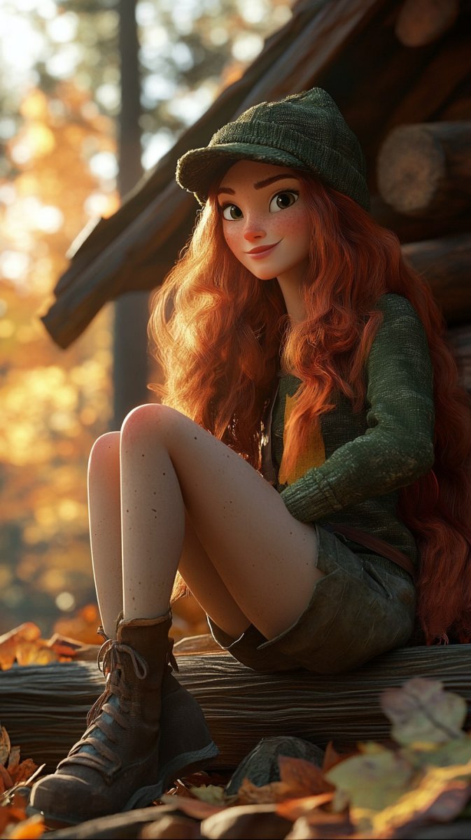 1woman, wendy corduroy, gravity falls, wearing a fluffy ushanka hat slightly askew on her head, revealing strands of her long, fiery red hair cascading down her shoulders, a weathered, green lumberjack shirt exposing her smooth skin underneath, a glimpse of her narrow waist, and red shorts barely visible, inside a rustic cabin in the woods, pixar style