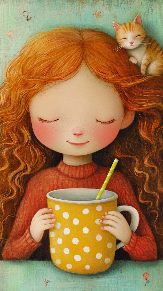 charming children's book illustration of a joyful girl with voluminous, fiery red curls, big amber eyes, and a cozy mint green turtleneck sweater. next to her is a blissful ginger cat with its eyes closed. they are sharing a yellow polka-dot mug with two straws. the style is soft, warm, and heartwarming, created with colored pencils and pastels.