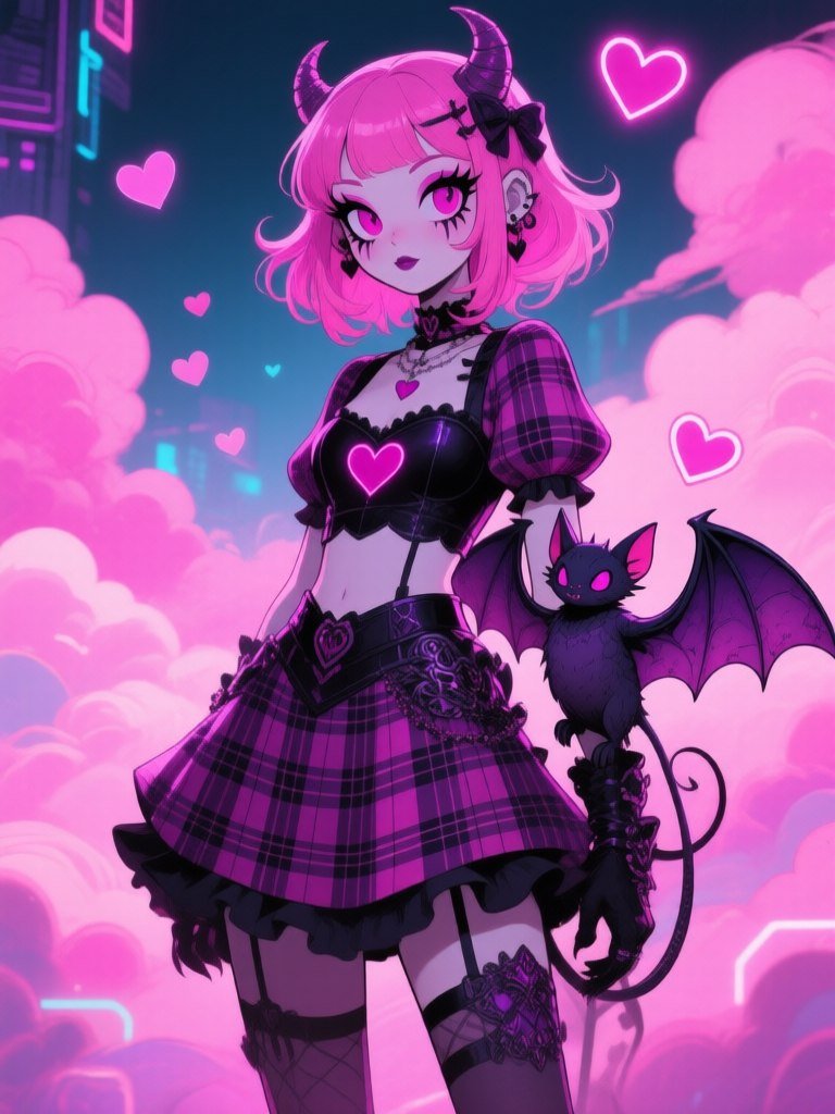 a cute and gothic full-body illustration of a pink-haired monster girl with heart-shaped features, dressed in a romantic plaid outfit, standing next to a whimsical bat, with intricate details in her makeup and a background of vibrant pink clouds and floating hearts, by Tim Shumate, digital art style, bright lighting, whimsical and enchanting atmosphere.