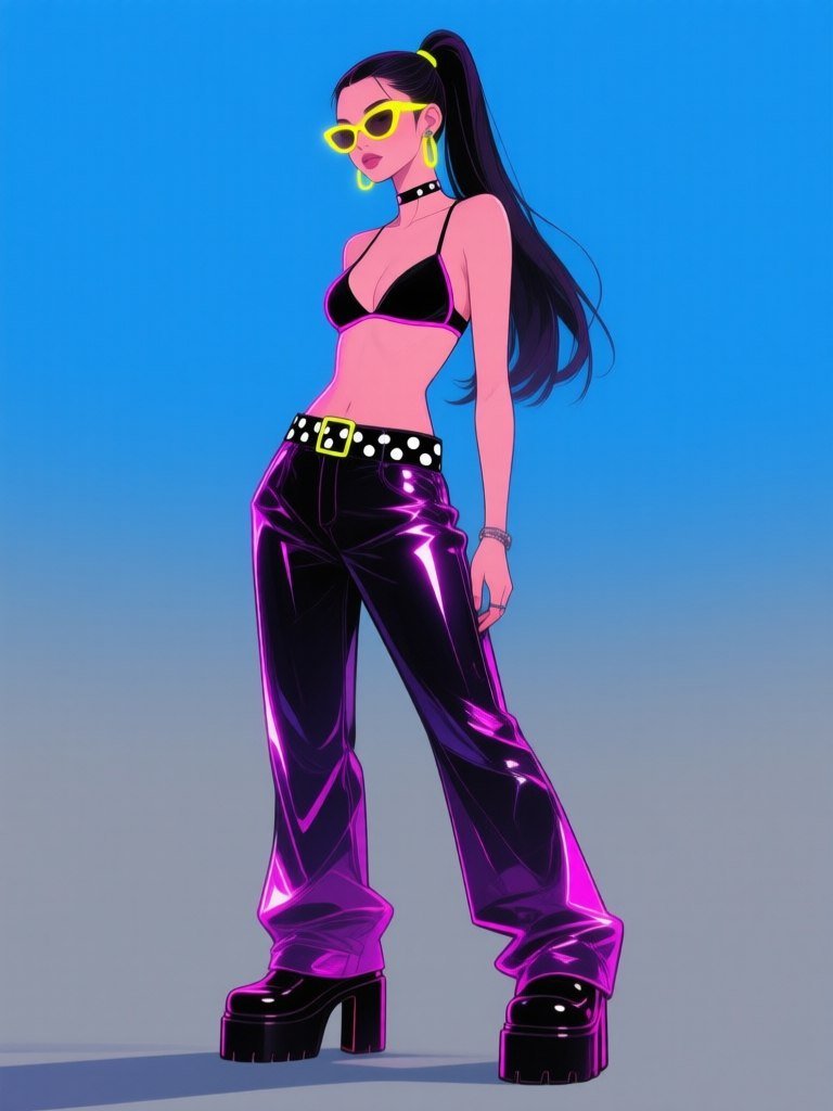 illustration, black bikini top, neon colors, edgy mood, shiny material, ink drawing, yellow sunglasses, chunky sole, reflective pants, high neckline, streetwear, standing against blue background, long dark hair, ponytail, high heels, studio, gray background, black belt with white polka dots, modern and edgy.