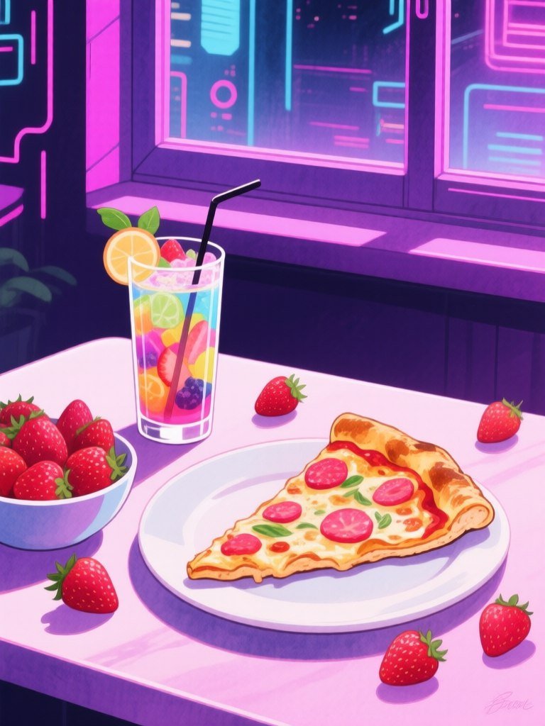На картине в технике акварели изображено аппетитное утро за столом. В фокусе – яркий и красочный завтрак, создающий атмосферу радости и тепла. На столе красуется ломтик пиццы с хрустящей золотисто-коричневой корочкой, привлекающий внимание своей простой геометрической формой. Рядом стоит изящный стакан, наполненный освежающим коктейлем из разноцветных фруктов, который добавляет динамики и игривости композиции. Свежая клубника, щедро рассыпанная вокруг миски, создает ощущение изобилия и свежести. Общая цветовая гамма картины выполнена в ярких и жизнерадостных тонах, подчеркивающих легкость и беззаботность момента. Окно на заднем плане пропускает мягкий свет, наполняя сцену теплом и создавая уютную обстановку. Картина передаёт ощущение домашнего уюта и простого удовольствия от вкусной еды в прекрасный день. Вся картина словно пронизана ощущением свежести и позитива, приглашая зрителя насладиться моментом и почувствовать радость жизни. Использование акварельной техники добавляет легкости и воздушности изображению, делая его особенно привлекательным и запоминающимся. Этот яркий натюрморт станет прекрасным украшением любого интерьера, наполняя пространство светом и позитивом. Он дарит ощущение утренней бодрости и готовности к новым свершениям