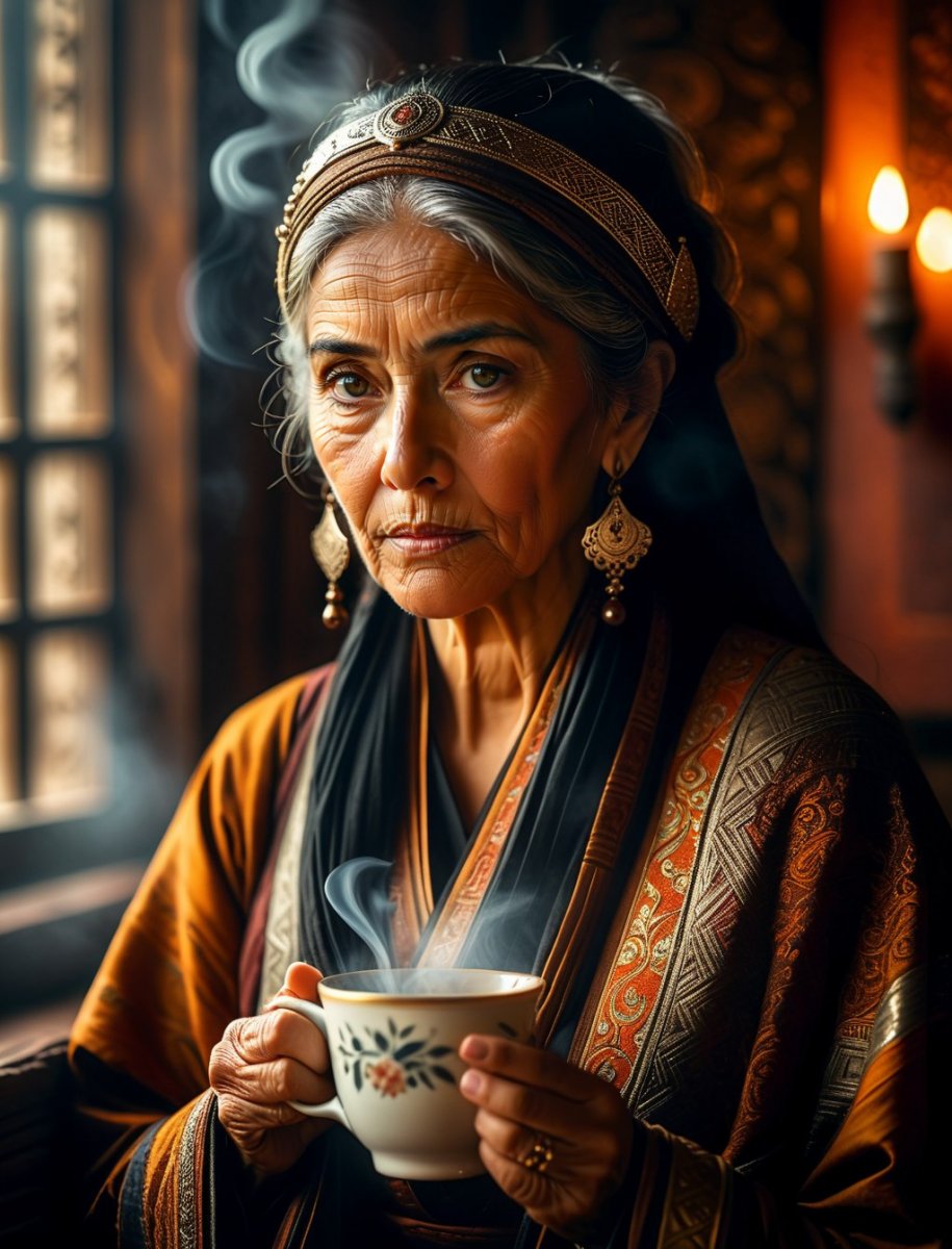 Wise old Eastern woman, contemplative gaze, dark room ambiance, warm lighting, steaming coffee cup, intricate traditional patterns, subtle textures, rich color palette, atmospheric depth, cinematic composition, detailed facial features, aged wisdom, serene expression, soft focus background, mystical aura, ancient knowledge, quiet strength, tranquil setting, muted tones, elegant simplicity, timeless beauty, cultural richness, spiritual connection, gentle shadows, peaceful atmosphere, comforting warmth, inviting stillness, profound insight, subtle details, artistic rendering, high resolution image, dramatic lighting, captivating portrait, evoca...
