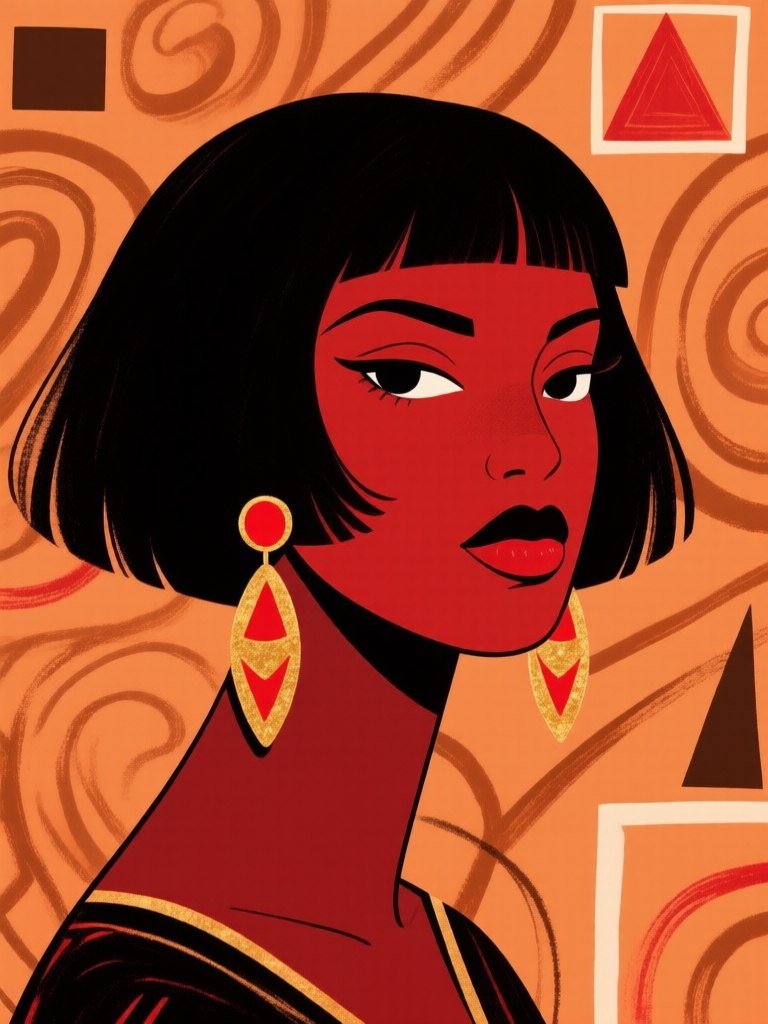 Загадочный портрет в духе авангарда: смелое сочетание черт ар-деко и влияния африканской графики создает неповторимый образ женщины. Изящные линии, характерные для рисунка тушью, формируют лицо с темными волосами, аккуратно подстриженными в стиле боб. Взгляд устремлен вдаль, а слегка приоткрытые губы окрашены насыщенным красным цветом, добавляя портрету нотку тайны и чувственности. Фон выполнен в теплых оранжево-коричневых тонах с вихрями и декоративными узорами, создавая ощущение глубины и динамики. Геометрические фигуры – квадраты, треугольники, прямоугольники – переплетаются с дерзкими линиями и мазками кисти, отсылая к африканскому искусству и подчеркивая абстрактную природу композиции. Большие серьги-люстры с красными и золотыми акцентами завершают образ, добавляя роскоши и элегантности. Вся работа пронизана атмосферой созерцательности и загадочности, вызывая у зрителя желание разгадать тайну этой необычной женщины. Стиль произведения напоминает о влиянии баухауза и дадаизма, сочетая в себе функциональность и провокационность. Это не просто портрет – это визуальная поэзия, сотканная из смелых форм, ярких цветов и глубокого символизма. Портрет излучает спокойствие и внутреннюю силу, оставляя неизгладимое впечатление у зрителя