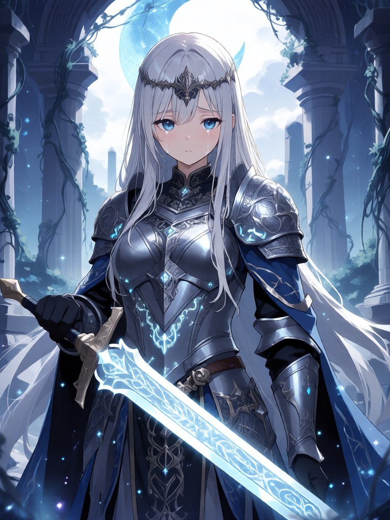 <lora:1914845:1>, anime, illustration 1girl, (revenant knight|sage), intricate armor interwoven with glowing spectral runes, wielding a shimmering blade of solidified moonlight, standing amidst the ruins of an ancient celestial temple overrun by ethereal vines, her face etched with sorrowful wisdom and determination as she channels ancestral power to banish encroaching shadows, a single tear tracing a path down her cheek, 😭.