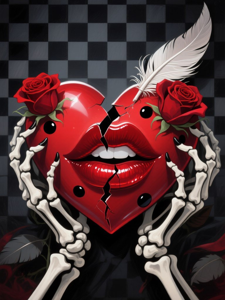 Мрачная красота и хрупкость чувств воплощены в этом завораживающем изображении. На переднем плане — реалистично прорисованные губы, покрытые глянцевым блеском, украшенные алыми розами и загадочными черными точками. Этот яркий акцент контрастирует с окружающей атмосферой трагизма и смерти. Символично обрамленные костлявыми руками, удерживающими разбитое сердце, губы становятся метафорой потерянной любви и неразрешенной боли. Мрачный фон в оттенках темно-серого и черного подчеркивает готическую эстетику композиции, а шахматный узор добавляет элемент загадочности и интриги. Объемное освещение и технология hdr создают потрясающий эффект глубины и реалистичности, словно картина написана маслом. Тончайшие детали перьев, тщательно проработанные в каждом элементе, усиливают ощущение роскоши и изысканности. Вдохновленный творчеством Майка Деодато, этот шедевр сочетает в себе элементы готики, реализма и сюрреализма, создавая уникальную визуальную историю о страсти, потере и вечной борьбе между жизнью и смертью. Высококачественная иллюстрация поражает своей детализацией и мастерством исполнения, приглашая зрителя погрузиться в мир темных фантазий и глубоких эмоций. Каждое пятно света, каждый штрих кисти, каждая деталь созданы для того, чтобы затронуть самые потаенные уголки души и оставить неизгладимый след в памяти. Это не просто изображение — это воплощение трагической красоты и вечной темы любви