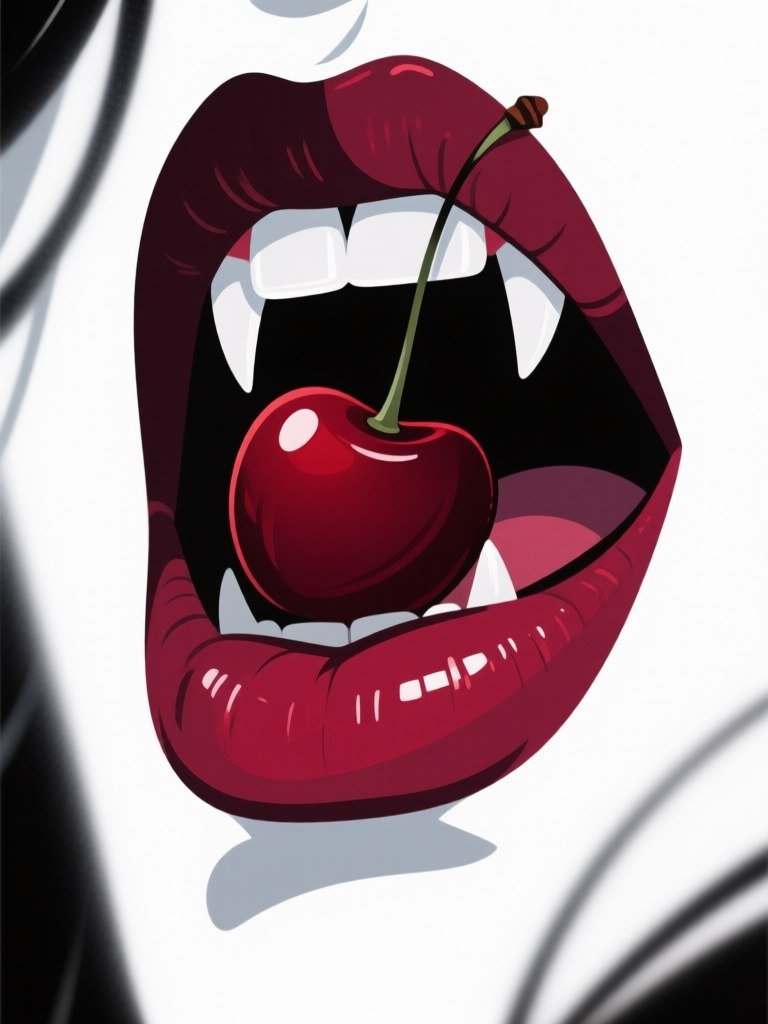 Вампирские губы с вишней: готический арт в стиле граффити и удр - Изображение, созданное нейросетью Qwen Ai Images