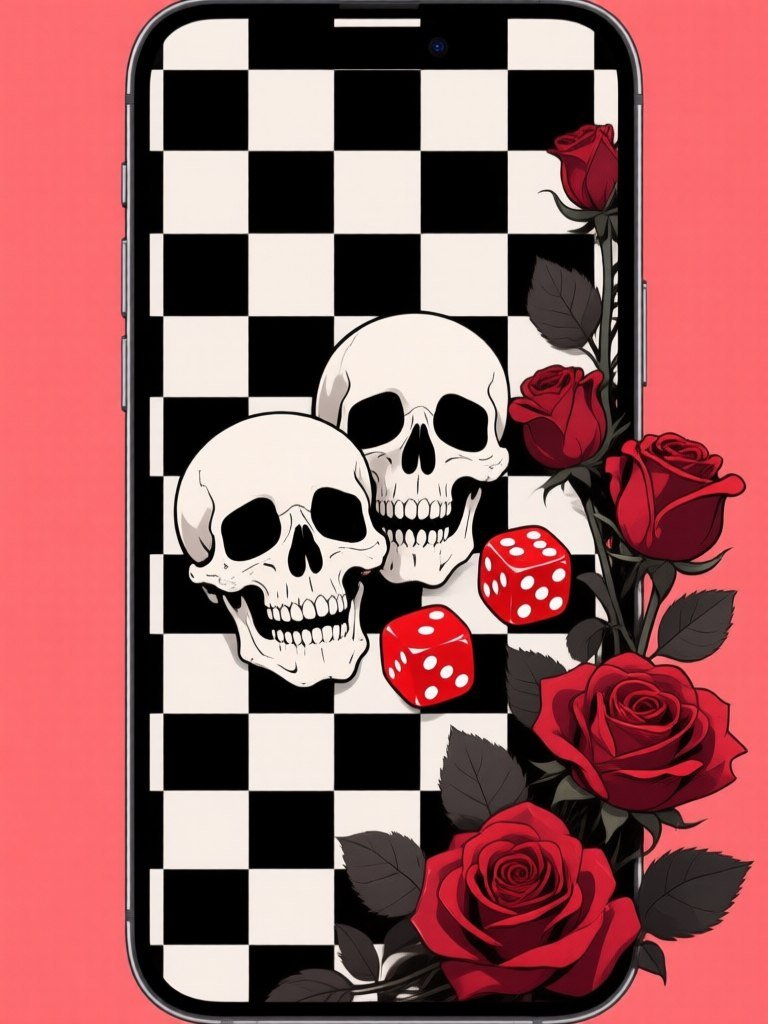 Мрачный готический фон для экрана телефона, погружающий в атмосферу тёмной фантазии. Изображение выполнено в чёрно-белой гамме с акцентами насыщенного красного цвета и включает в себя черепа и алые игральные кости, создающие ощущение загадочности и опасности. По бокам композиции изящно ниспадают розы, добавляя элемент романтики и декаданса. Симметричная структура изображения подчёркивает его строгость и гармонию, а высокая детализация текстур позволяет рассмотреть мельчайшие элементы, создавая эффект реалистичности. Фон оформлен в формате ультравысокой чёткости (UHD), обеспечивая кристально чистое изображение на любом экране. Дополнительный элемент – узор из чёрных и белых шахматных клеток, добавляющий динамики и контраста, завершая сложный и многогранный визуальный ряд, идеально подходящий для создания уникального стиля вашего мобильного устройства. Этот фон станет прекрасным украшением для поклонников готической эстетики и тёмного фэнтези, отражая их индивидуальность и вкус к прекрасному. Его можно использовать в качестве обоев на телефон или в социальных сетях, чтобы выделиться из толпы и подчеркнуть свою принадлежность к миру загадок и тайн