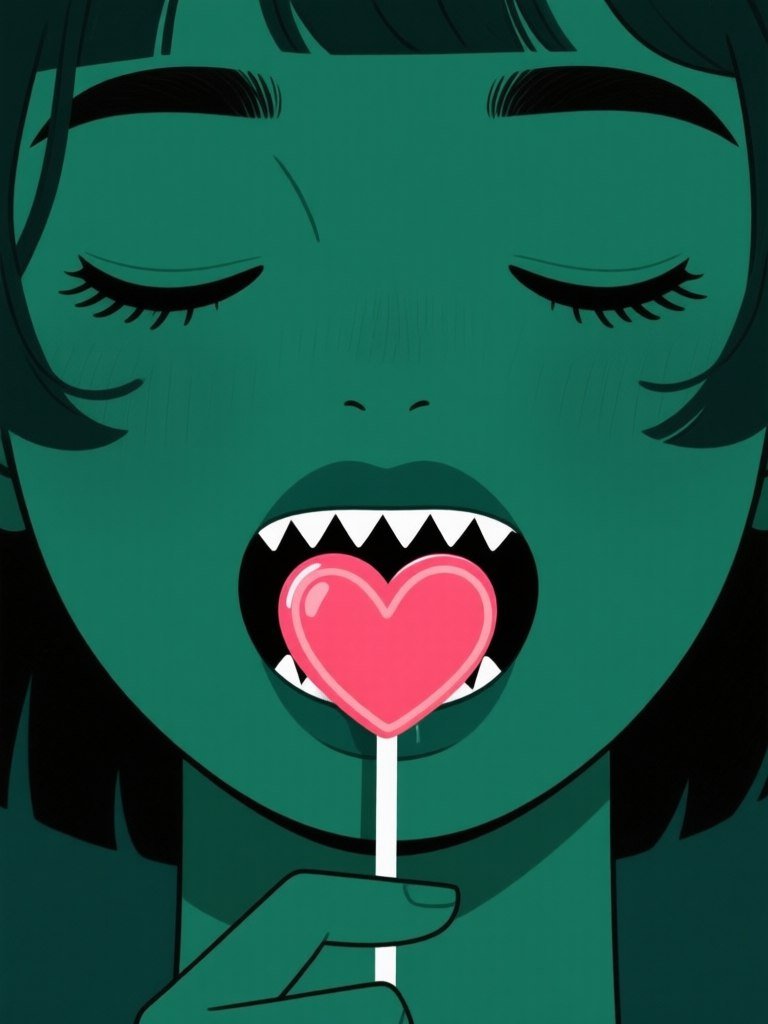 portrait of person’s mouth holding heart-shaped lollipop, serrated edge, eyes closed, dark green color, playful and whimsical mood.