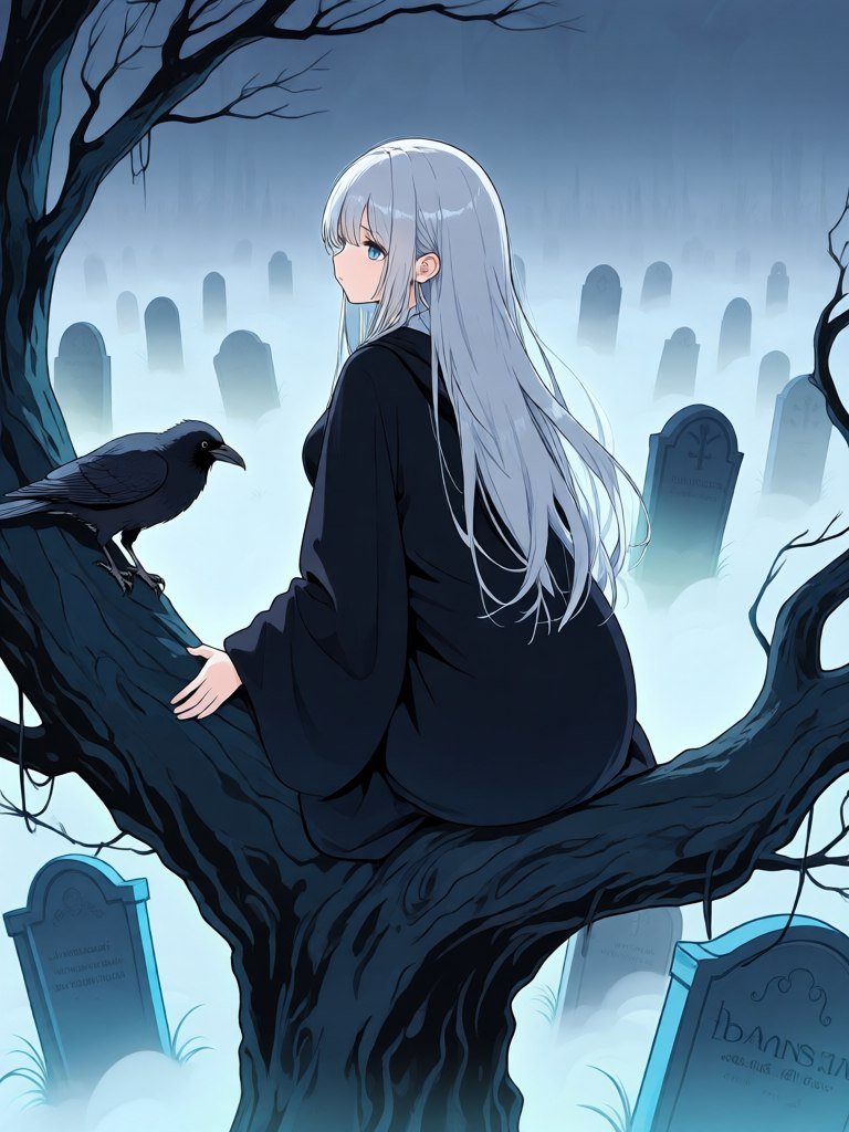 <lora:1914845:1>, anime, illustration 1girl, (banshee|seer), perched atop a gnarled willow tree overlooking a misty graveyard, her long silver hair cascading down her back as she emits mournful melodies that resonate with the souls of the departed, eyes filled with an unsettling clarity 😮, a single raven resting on her outstretched arm amidst swirling spectral fog and glowing tombstones.
