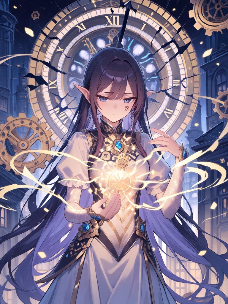 Волшебница времени, представительница расы Фомориан, в отчаянной попытке восстановить разрушенный временем город. Её изображение выполнено в стиле аниме-иллюстрации и демонстрирует невероятную концентрацию и грацию. Она управляет энергиями времени сложными и изящными жестами, её кожа мерцает неземным светом, отражая сложность задачи – исправление расколотых временных линий. Вокруг неё бушуют вихри шестеренок и искаженные отражения прошлого, создавая атмосферу хаоса и отчаяния. На лбу волшебницы застыла задумчивая морщинка, свидетельствующая о глубоких раздумьях над сложностью пространственно-временного континуума. Её фигура выделяется на фоне разрушенной архитектуры города, словно маяк надежды в мире, поглощенном временем. Художественное решение передает ощущение хрупкости времени и ответственности за его восстановление. Эта иллюстрация – визуальное воплощение борьбы с необратимым и попытка вернуть утраченное прошлое. Она представляет собой захватывающее сочетание фэнтезийных элементов и сложной художественной техники, демонстрирующей мастерство автора в создании завораживающих образов. Вся картина пронизана ощущением таинственности и глубокого смысла, заставляя зрителя задуматься о природе времени и его влиянии на мир