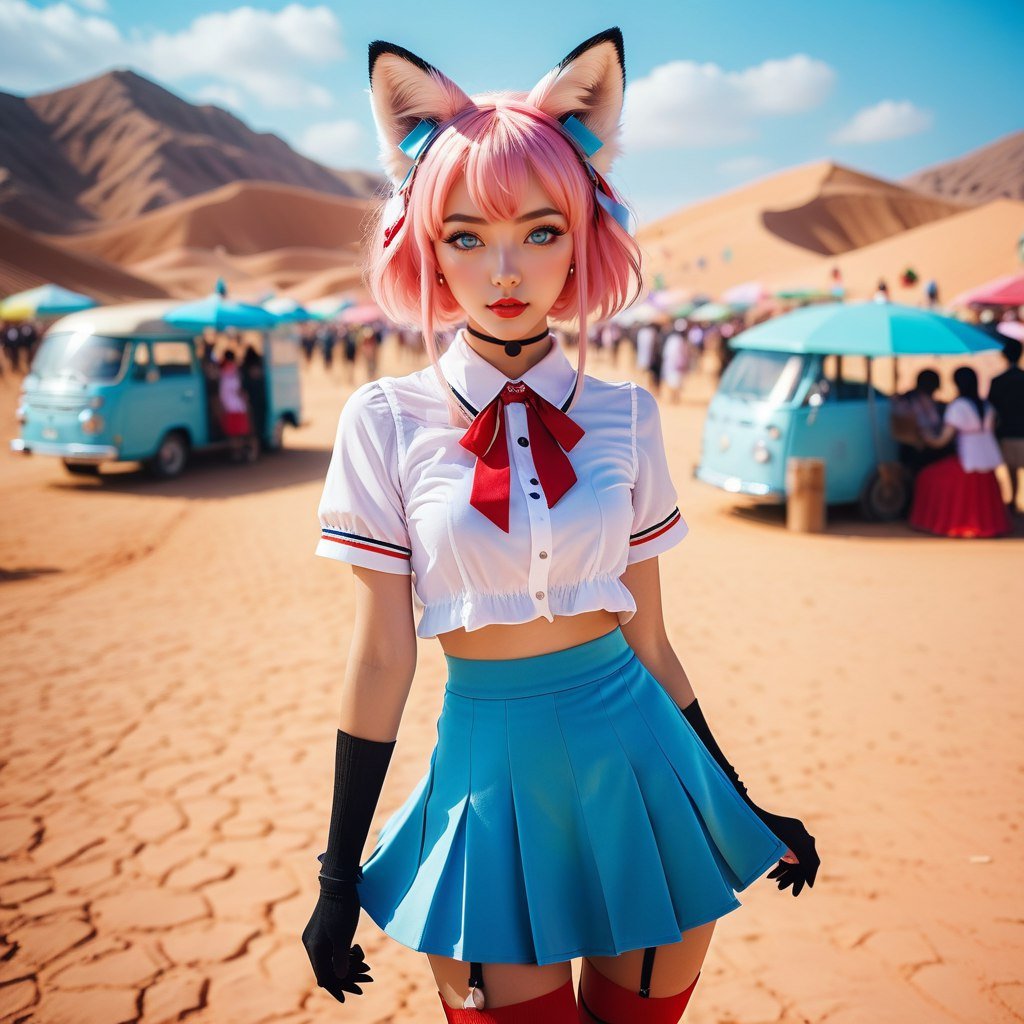 masterpiece, best quality, anime coloring, absurd, very aesthetic, absurdres, 69yottea_style_illu, Hype4realistic, 7481llu, pastel colours, pink hair, fox ears, blue eyes, thigh high socks, detailed eyes, red lips, wearing short skirt, high side slit skirt, In the desert, music festival, people in background, analog style, pastel colors, vintage, depth of field, faded color, rakugakingu