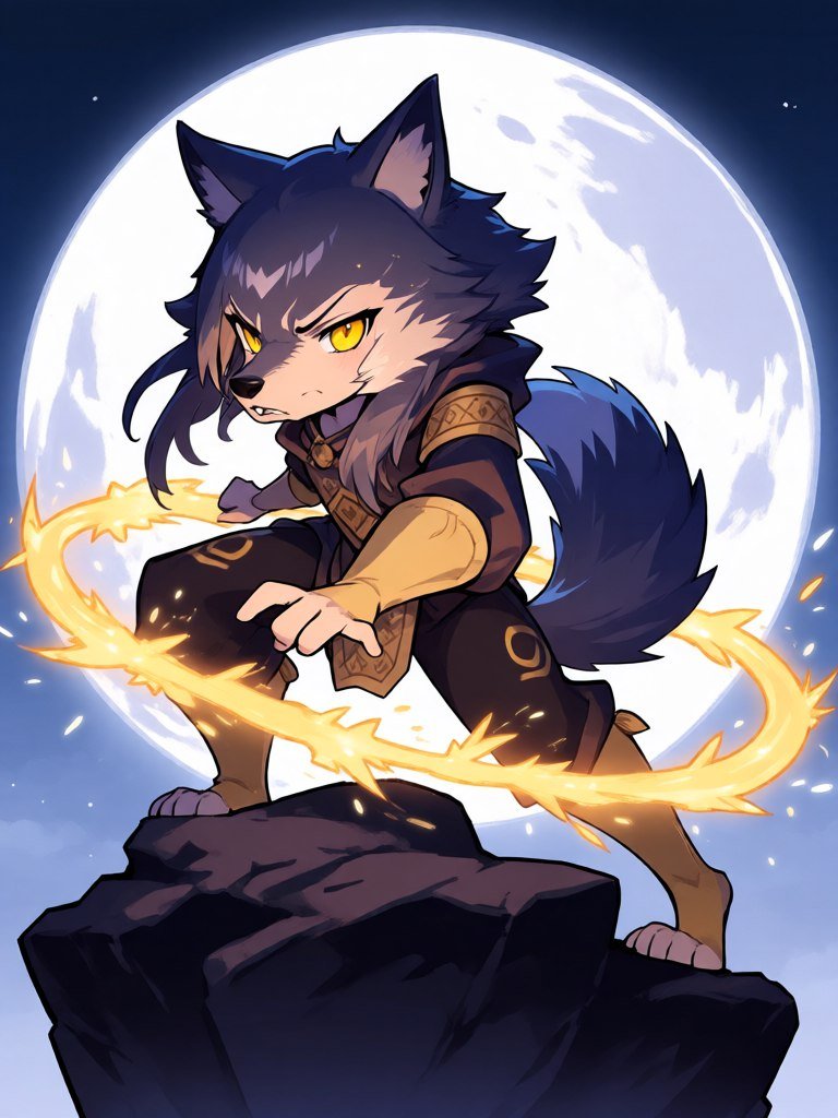 <lora:1914845:1>, anime, illustration 1girl, (werewolf|mage), transformed under the full moon with shimmering fur and piercing yellow eyes, standing defiantly on a rocky outcrop, while casting an ancient spell that creates a circle of sparks around her, her face marked by determination and strength, radiating an aura of primal magic, 😠.