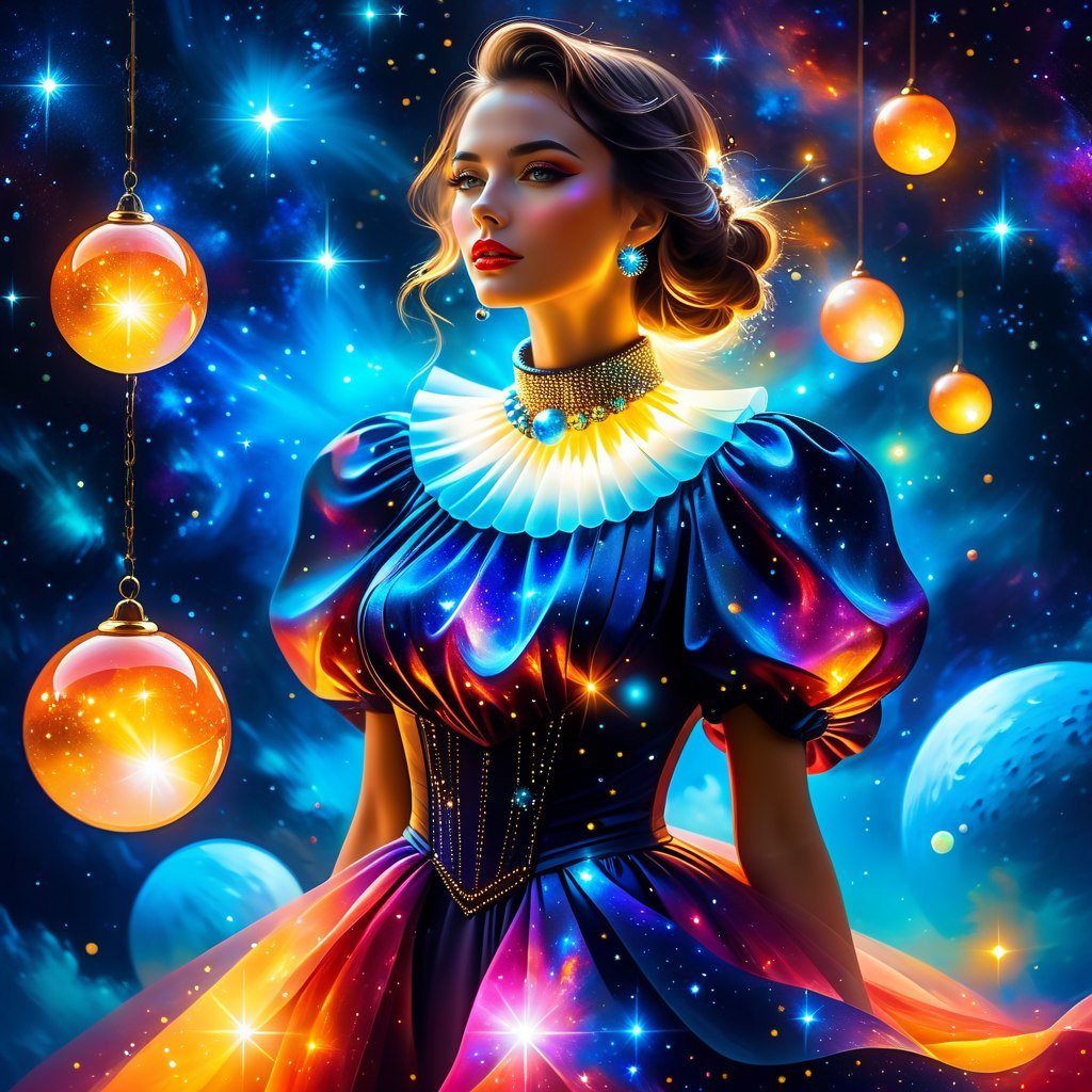 красивая женщина , платье с воротником, космическая ночь, светящиеся шары, сказочный сюрреализм, светящаяся текстура, цифровое импасто, спектральное свечение