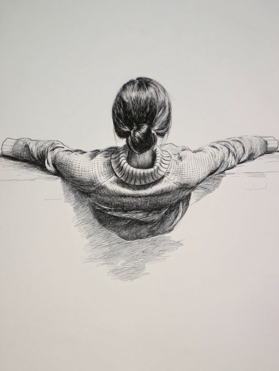 Изящный скетч задней части женского свитера с высоким горлом, развернутого и лежащего на гладкой поверхности. Длинные рукава элегантно раскинулись по обе стороны, создавая ощущение плавности и воздушности. Этюд демонстрирует детали кроя и силуэт изделия, подчеркивая его изысканность и женственность. Акцент сделан на форме воротника-стойки и линии плеча, что позволяет оценить конструктивные особенности модели. Визуализация передает ощущение мягкости ткани и продуманности дизайна, идеально подходящего для создания стильного и комфортного образа. Изображение может служить основой для дальнейшей разработки дизайна или использоваться в качестве иллюстрации к техническому описанию. Свитер выглядит лаконично и современно, сочетая в себе классические элементы и актуальные тенденции моды. Стиль изображения – реалистичный эскиз, выполненный с вниманием к деталям, что позволяет полностью оценить эстетические качества изделия и его потенциал для воплощения в реальной жизни. Этот набросок - отличная отправная точка для создания уникального и запоминающегося предмета гардероба. Детализированное изображение подчеркивает элегантность и утонченность дизайна, делая акцент на комфорте и практичности